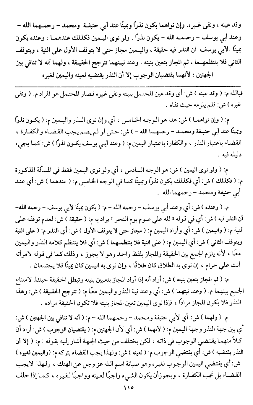 م: (ثم المجاز يتعين بنيته) ش: أراد أنه إذا أراد المجاز بتعيين بنيته وتبطل الحقيقة حينئذ لامتناع الجمع بينهما م: (وعند نيتهما) ش: أي وعند نية النذر واليمين معاً م: (تترجح الحقيقة) ش: وهذا النذر فلا يكون المجاز مراداً، فإذا نوى اليمين تعين المجاز بنيته فلا تكون الحقيقة مراده.