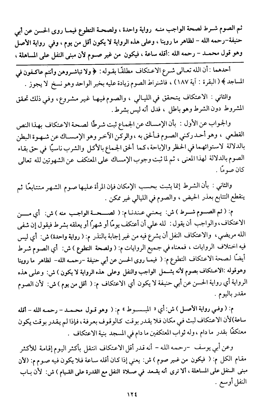 م: (ثم الصوم شرط) ش: يعني عندنا م: (لصحة الواجب منه) ش: أي من الاعتكاف، والواجب أن يقول: لله علي أن أعتكف يوماً أو شهراً أو يعلقه بشرط فيقول إن شفى الله مريضي، والاعتكاف النفل أن يشرع فيه من غير إجابة بالنذر م: (رواية واحدة) ش: أي ليس فيه اختلاف الروايات، فمعناه في جميع الروايات م: (ولصحة التطوع) ش: أي الصوم شرط أيضاً لصحة الاعتكاف التطوع م: (فيما روى الحسن عن أبي حنيفة - رَحِمَهُ اللَّهُ - لظاهر ما روينا، وهو قوله: الاعتكاف بصوم لأنه يشمل الواجب والنفل وعلى هذه الرواية لا يكون) ش: وعلى هذه الرواية أي رواية الحسن عن أبي حنيفة لا يكون أي الاعتكاف م: (أقل من يوم) ش: لأن الصوم مقدر باليوم.