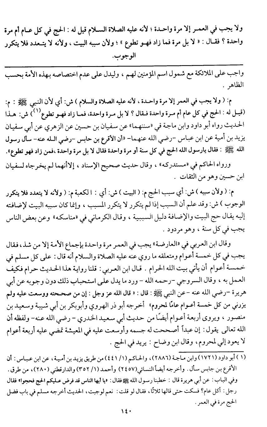 وقال ابن العربي في " العارضة " يجب في العمر مرة واحدة بإجماع الأمة إلا من شذ، فقال يجب في كل خمسة أعوام ومتعلقه ماروي عنه - عَلَيْهِ الصَّلَاةُ وَالسَّلَامُ - أنه قال: «على كل مسلم في خمسة أعوام أن يأتي بيت الله الحرام» . قال ابن العربي: قلنا رواية هذا الحديث حرام فكيف العمل به، وقال السروجي - رَحِمَهُ اللَّهُ - ورد ما يدل على استحباب ذلك دون وجوبه عن أبي هريرة - رَضِيَ اللَّهُ عَنْهُ - عن النبي - صَلَّى اللَّهُ عَلَيْهِ وَسَلَّمَ -: قال: «قال الله عز وجل: إن من صححته ووسعت عليه ولم يزرني من كل خمسة أعوام عاماً لمحروم» أخرجه أبو ذر الهروي وأبو بكر بن أبي شيبة وسعيد بن منصور، ويروى أربعة أعوام أيضاً من حديث أبي سعيد الخدري - رَضِيَ اللَّهُ عَنْهُ - ولفظه «أن الله تعالى يقول: إن عبداً أصححت له جسمه وأوسعت عليه في المعيشة تمضي عليه أربعة أعوام لا يعود إلي لمحروم» وقال ابن وضاح: يريد في الحج.
