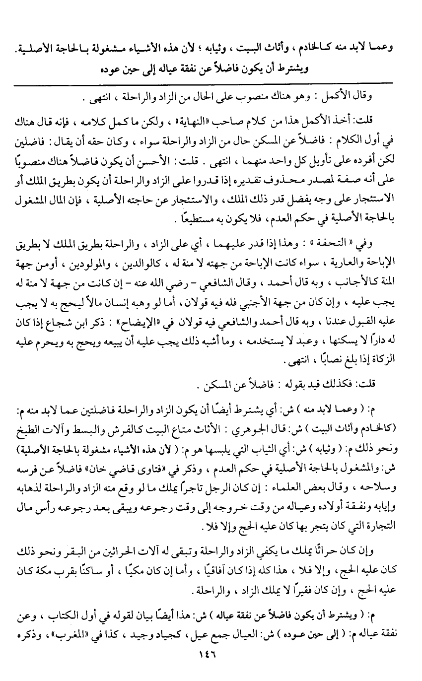 م: (وعما لا بد منه) ش: أي يشترط أيضاً أن يكون الزاد والراحلة فاضلتين عما لا بد منه م: (كالخادم، وأثاث البيت) ش: قال الجوهري: الأثاث متاع البيت كالفرش والبسط وآلات الطبخ ونحو ذلك م: (وثيابه) ش: أي الثياب التي يلبسها هو م: (لأن هذه الأشياء مشغولة بالحاجة الأصلية) ش: والمشغول بالحاجة الأصلية في حكم العدم، وذكر في " فتاوى قاضي خان " فاضلاً عن فرسه وسلاحه، وقال بعض العلماء: إن كان الرجل تاجراً يملك ما لو وقع منه الزاد والراحلة لذهابه وإيابه ونفقة أولاده وعياله من وقت خروجه إلى وقت رجوعه ويبقى بعد رجوعه رأس مال التجارة التي كان يتجر بها كان عليه الحج وإلا فلا.