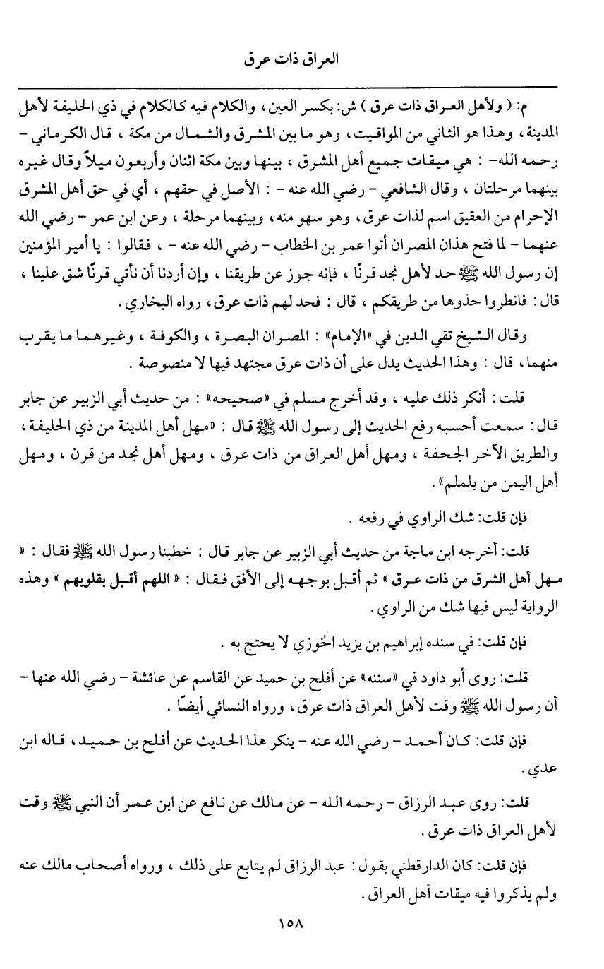 ـــــــــــــــــــــــــــــQم: (ولأهل العراق ذات عرق) ش: بكسر العين، والكلام فيه كالكلام في ذي الحليفة لأهل المدينة، وهذا هو الثاني من المواقيت، وهو ما بين المشرق والشمال من مكة، قال الكرماني - رَحِمَهُ اللَّهُ -: هي ميقات جميع أهل المشرق، بينها وبين مكة اثنان وأربعون ميلاً وقال غيره بينهما مرحلتان، وقال الشافعي - رَضِيَ اللَّهُ عَنْهُ -: الأصل في حقهم، أي في حق أهل المشرق الإحرام من العقيق اسم لذات عرق، وهو سهو منه، وبينهما مرحلة، وعن ابن عمر - رَضِيَ اللَّهُ عَنْهُمَا - لما فتح هذان المصران أتوا عمر بن الخطاب - رَضِيَ اللَّهُ عَنْهُ -، فقالوا: يا أمير المؤمنين إن رسول الله - صَلَّى اللَّهُ عَلَيْهِ وَسَلَّمَ - حد لأهل نجد قرناً، فإنه جوز عن طريقنا، وإن أردنا أن نأتي قرناً شق علينا، قال: فانظروا حذوها من طريقكم، قال: فحد لهم ذات عرق، رواه البخاري.