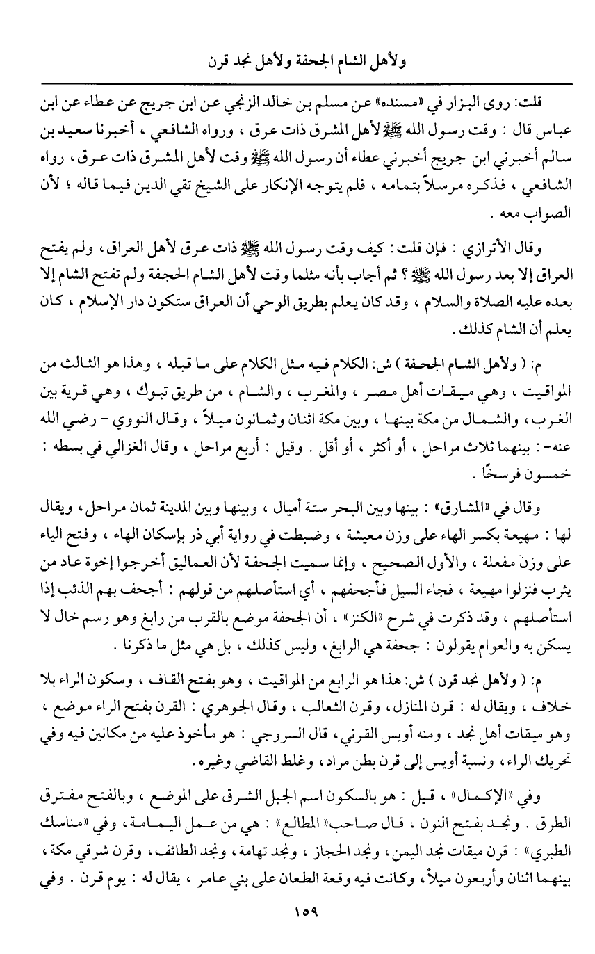 وقال الأترازي: فإن قلت: كيف وقت رسول الله - صَلَّى اللَّهُ عَلَيْهِ وَسَلَّمَ - ذات عرق لأهل العراق، ولم يفتح العراق إلا بعد رسول الله - صَلَّى اللَّهُ عَلَيْهِ وَسَلَّمَ -؟ ثم أجاب بأنه مثلما وقت لأهل الشام الجحفة ولم تفتح الشام إلا بعده - عَلَيْهِ الصَّلَاةُ وَالسَّلَامُ -، وقد كان يعلم بطريق الوحي أن العراق ستكون دار الإسلام، كان يعلم أن الشام كذلك.