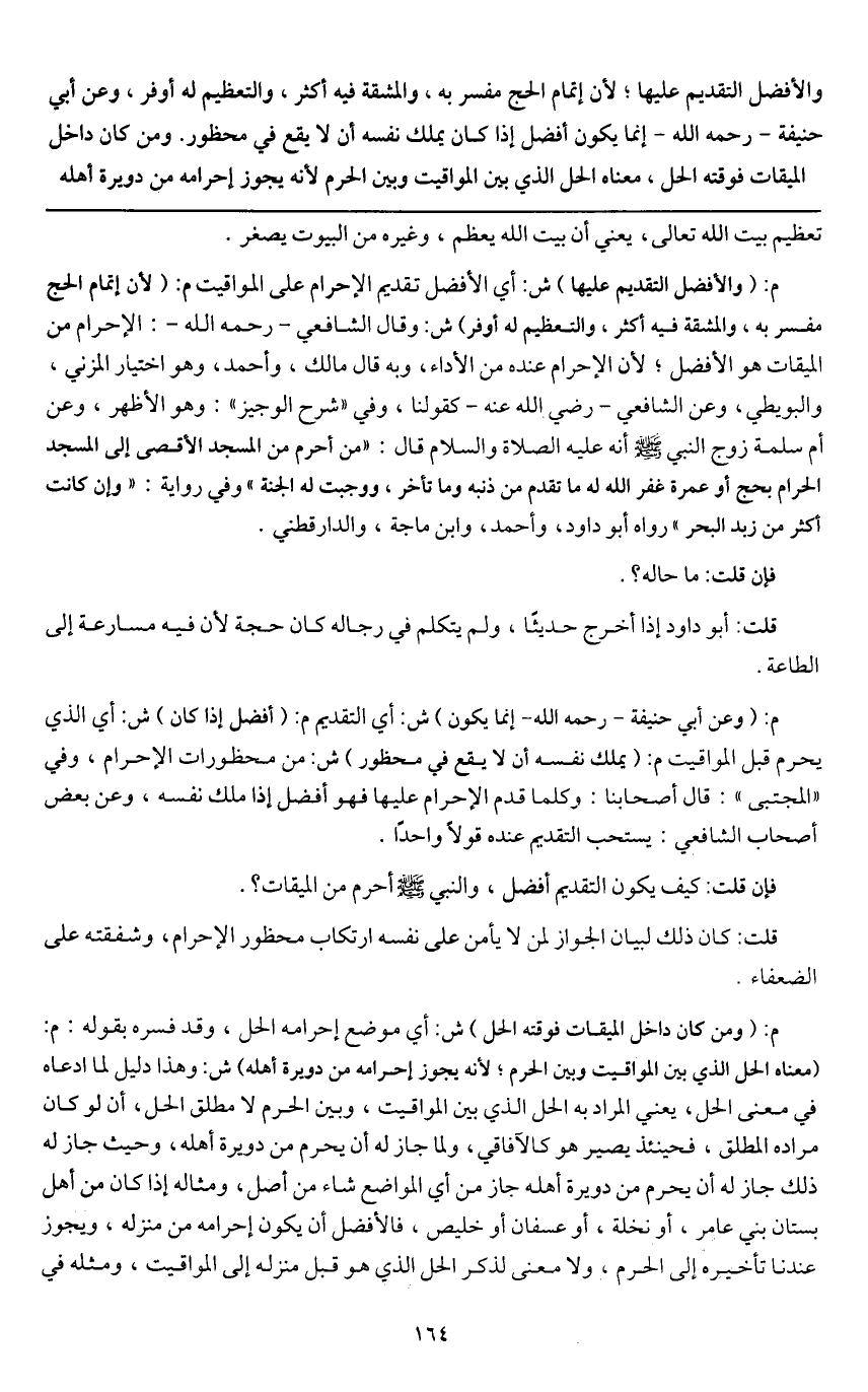 م: (والأفضل التقديم عليها) ش: أي الأفضل تقديم الإحرام على المواقيت م: (لأن إتمام الحج مفسر به، والمشقة فيه أكثر، والتعظيم أوفر) ش: وقال الشافعي - رَحِمَهُ اللَّهُ -: الإحرام من الميقات هو الأفضل؛ لأن الإحرام عنده من الأداء، وبه قال مالك، وأحمد، وهو اختيار المزني، والبويطي، وعن الشافعي - رَضِيَ اللَّهُ عَنْهُ - كقولنا، وفي " شرح الوجيز ": وهو الأظهر، وعن أم سلمة زوج النبي - صَلَّى اللَّهُ عَلَيْهِ وَسَلَّمَ - أنه - عَلَيْهِ الصَّلَاةُ وَالسَّلَامُ - قال: «من أحرم من المسجد الأقصى إلى المسجد الحرام بحج أو عمرة غفر الله له ما تقدم من ذنبه وما تأخر، ووجبت له الجنة» وفي رواية: «وإن كانت أكثر من زبد البحر» رواه أبو داود، وأحمد، وابن ماجه، والدارقطني.