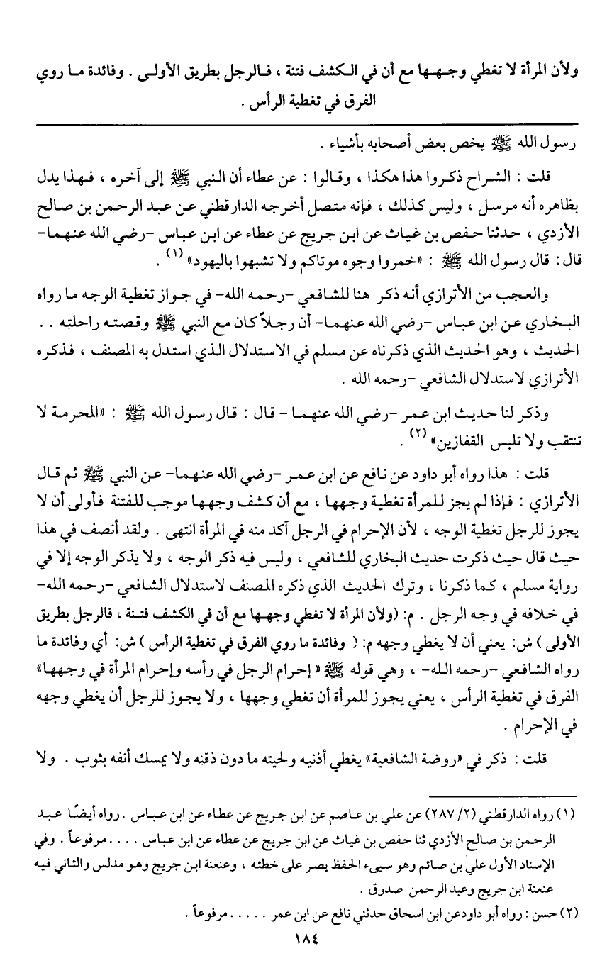 ولأن المرأة لا تغطي وجهها مع أن في الكشف فتنة، فالرجل بطريق الأولى. وفائدة ما روي الفرق في تغطية الرأس.