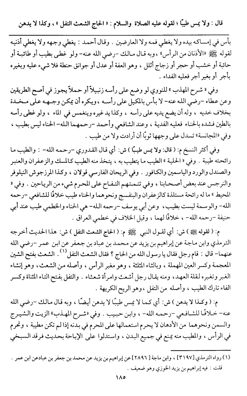 م: (لقوله - صَلَّى اللَّهُ عَلَيْهِ وَسَلَّمَ -) ش: أي لقول النبي - صَلَّى اللَّهُ عَلَيْهِ وَسَلَّمَ - م: «الحاج الشعث التفل» ش: هذا الحديث أخرجه الترمذي وابن ماجه عن إبراهيم بن يزيد عن محمد بن عباد بن جعفر عن ابن عمر - رَضِيَ اللَّهُ عَنْهُمَا - قال: «قام رجل فقال يا رسول الله من الحاج؟ فقال الشعث التفل» ". الشعث بفتح الشين المعجمة وكسر العين المهملة، وبالثاء المثلثة، وهو مغبر الرأس، وأصله من الشعث، وهو إنشاء الغبر وتغبره لقلة العهد، ومنه يقال رجل أشعث وامرأة شعثاء. والتفل بفتح التاء المثناة وكسر الفاء تارك الطيب، وأصله من التفل، وهو الريح الكريهة.
