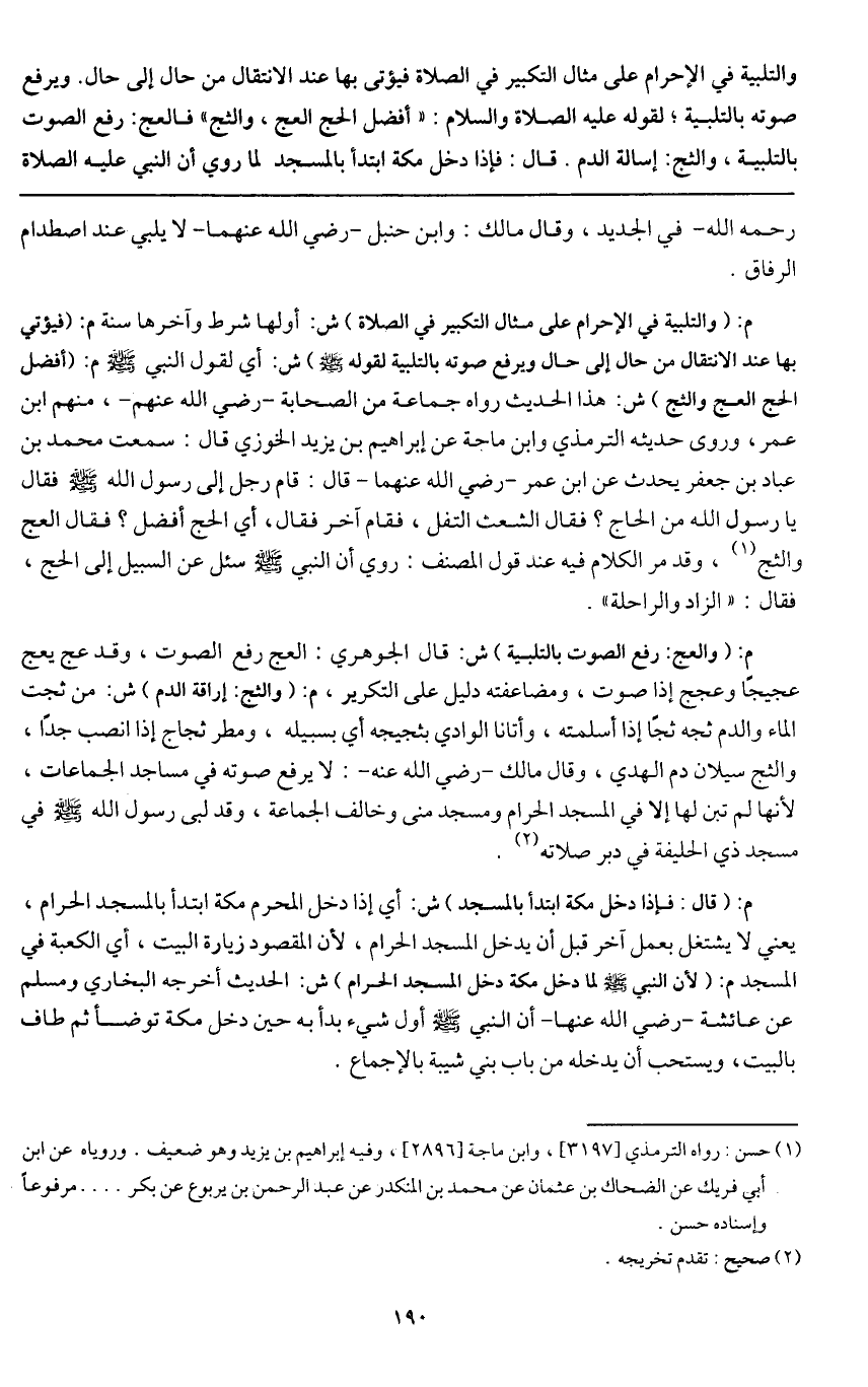 والتلبية في الإحرام على مثال التكبير في الصلاة، فيؤتى بها عند الانتقال من حال إلى حال. ويرفع صوته بالتلبية؛ لقوله - عَلَيْهِ الصَّلَاةُ وَالسَّلَامُ -: «أفضل الحج العج والثج» فالعج: رفع الصوت بالتلبية، والثج إسالة الدم.