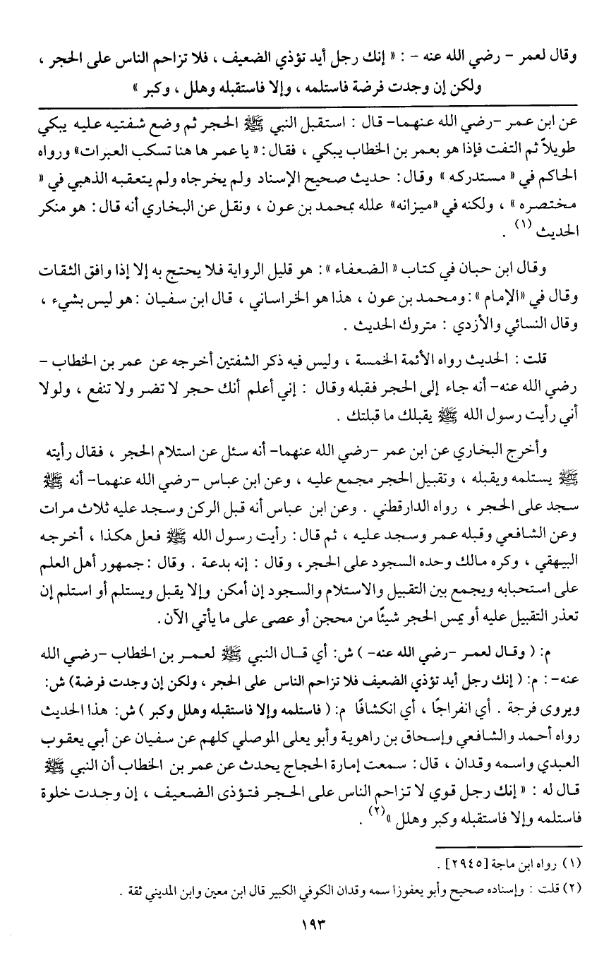 ـــــــــــــــــــــــــــــQعن ابن عمر - رَضِيَ اللَّهُ عَنْهُمَا - قال: «استقبل النبي - صَلَّى اللَّهُ عَلَيْهِ وَسَلَّمَ - الحجر ثم وضع شفتيه عليه يبكي طويلاً ثم التفت فإذا هو بعمر بن الخطاب يبكي، فقال: " يا عمر ها هنا تسكب العبرات» ورواه الحاكم في " مستدركه " وقال: حديث صحيح الإسناد ولم يخرجاه ولم يتعقبه الذهبي في " مختصره "، ولكنه في " ميزانه " علله بمحمد بن عون، ونقل عن البخاري أنه قال: هو منكر الحديث.