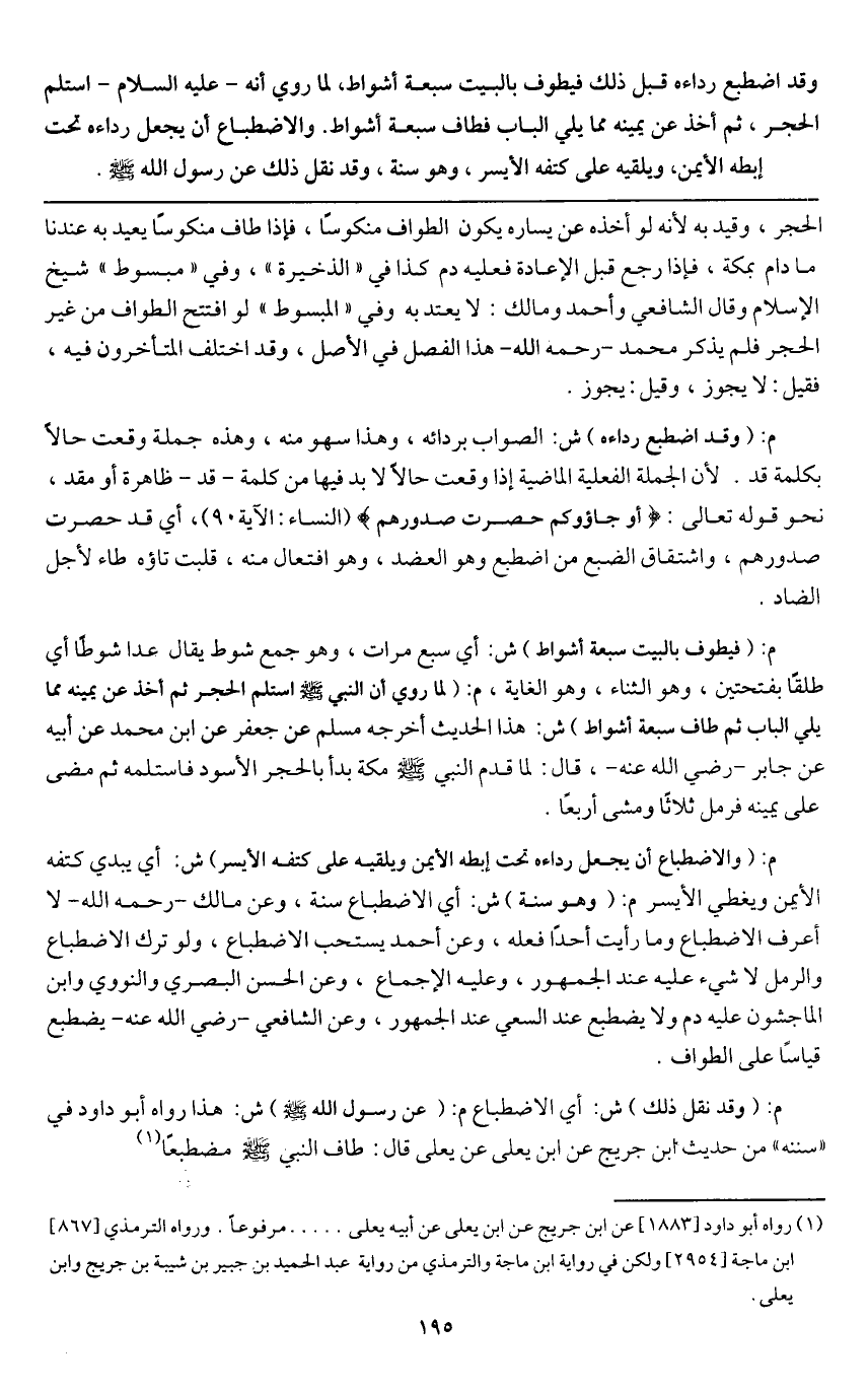 م: (وقد اضطبع رداءه) ش: الصواب بردائه، وهذا سهو منه، وهذه جملة وقعت حالاً بكلمة قد. لأن الجملة الفعلية الماضية إذا وقعت حالا لا بد فيها من كلمة - قد - ظاهرة أو مقد، نحو قَوْله تَعَالَى: {أَوْ جَاءُوكُمْ حَصِرَتْ صُدُورُهُمْ} [النساء: 90] [النساء: الآية 90] ، أي قد حصرت صدورهم، واشتقاق الضبع من اضطبع وهو العضد، وهو افتعال منه، قلبت تاؤه طاء لأجل الضاد.