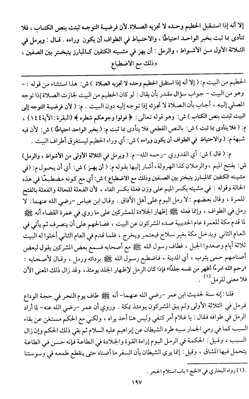 ـــــــــــــــــــــــــــــQالحطيم من البيت م: (إلا أنه إذا استقبل الحطيم وحده لا تجزيه الصلاة) ش: هذا استثناء من قوله: - وهو من البيت - جواب سؤال مقدر بأن يقال: لو كان الحطيم من البيت لجازت الصلاة إذا توجه المصلي إليه، أجاب بأن الصلاة لا تجزئه إذا توجه إليه دون البيت. م: (لأن فرضية التوجه إلى البيت ثبتت بنص الكتاب) ش: وهو قَوْله تَعَالَى: {فَوَلُّوا وُجُوهَكُمْ شَطْرَهُ} [البقرة: 144] [البقرة: الآية 144] ، م: (فلا يتأدى بما ثبت) ش: بالنص القطعي فلا يتأدى بما ثبت م: (بخبر الواحد احتياطاً) ش: لأن فيه شبهة م: (والاحتياط في الطواف أن يكون وراءه) ش: أي وراء الحطيم ليستغرق أطراف البيت.