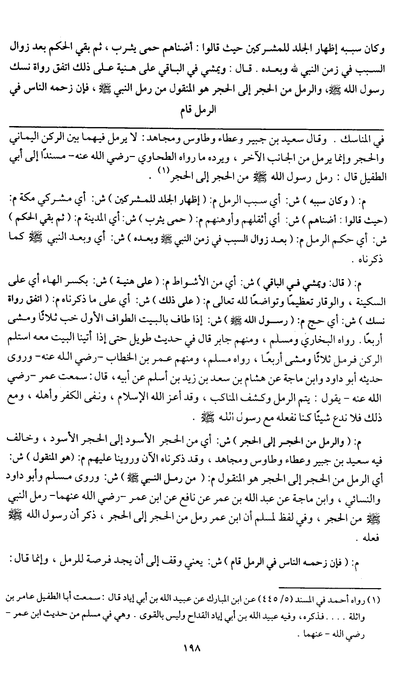 وكان سببه إظهار الجلد للمشركين حيث قالوا: أضناهم حمى يثرب ثم بقي الحكم بعد زوال السبب في زمن النبي لله وبعده. قال: ويمشي في الباقي على هنية على ذلك اتفق رواة نسك رسول الله - صَلَّى اللَّهُ عَلَيْهِ وَسَلَّمَ -، والرمل من الحجر إلى الحجر هو المنقول من رمل النبي - صَلَّى اللَّهُ عَلَيْهِ وَسَلَّمَ -، فإن زحمه الناس في الرمل قام