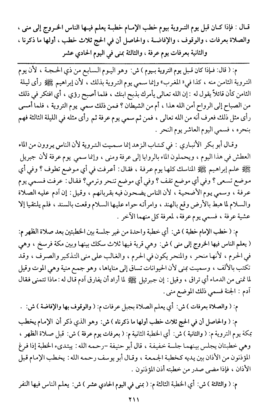 قال: فإذا كان قبل يوم التروية بيوم خطب الإمام خطبة يعلم فيها الناس الخروج إلى منى والصلاة بعرفات والوقوف، والإفاضة، والحاصل أن في الحج ثلاث خطب، أولها ما ذكرنا، والثانية بعرفات يوم عرفة، والثالثة بمنى في اليوم الحادي عشر