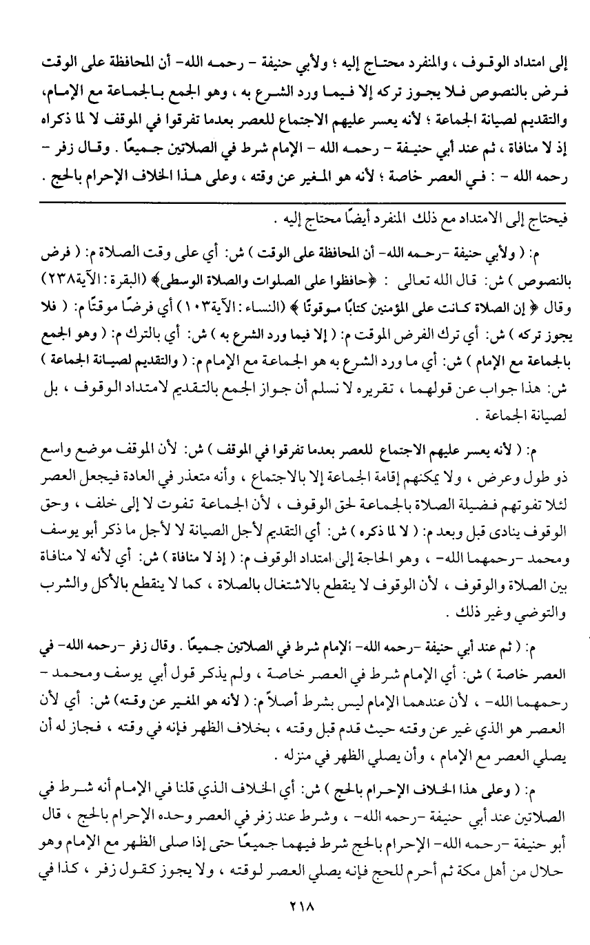إلى امتداد الوقوف، والمنفرد محتاج إليه؛ ولأبي حنيفة - رَحِمَهُ اللَّهُ - أن المحافظة على الوقت فرض بالنصوص فلا يجوز تركه إلا فيما ورد الشرع به، وهو الجمع بالجماعة مع الإمام، والتقديم لصيانة الجماعة؛ لأنه يعسر عليهم الاجتماع للعصر بعد ما تفرقوا في الموقف لا لما ذكراه إذ لا منافاة، ثم عند أبي حنيفة - رَحِمَهُ اللَّهُ - الإمام شرط في الصلاتين جميعا. وقال زفر - رَحِمَهُ اللَّهُ -: في العصر خاصة؛ لأنه هو المغير عن وقته، وعلى هذا الخلاف الإحرام بالحج.