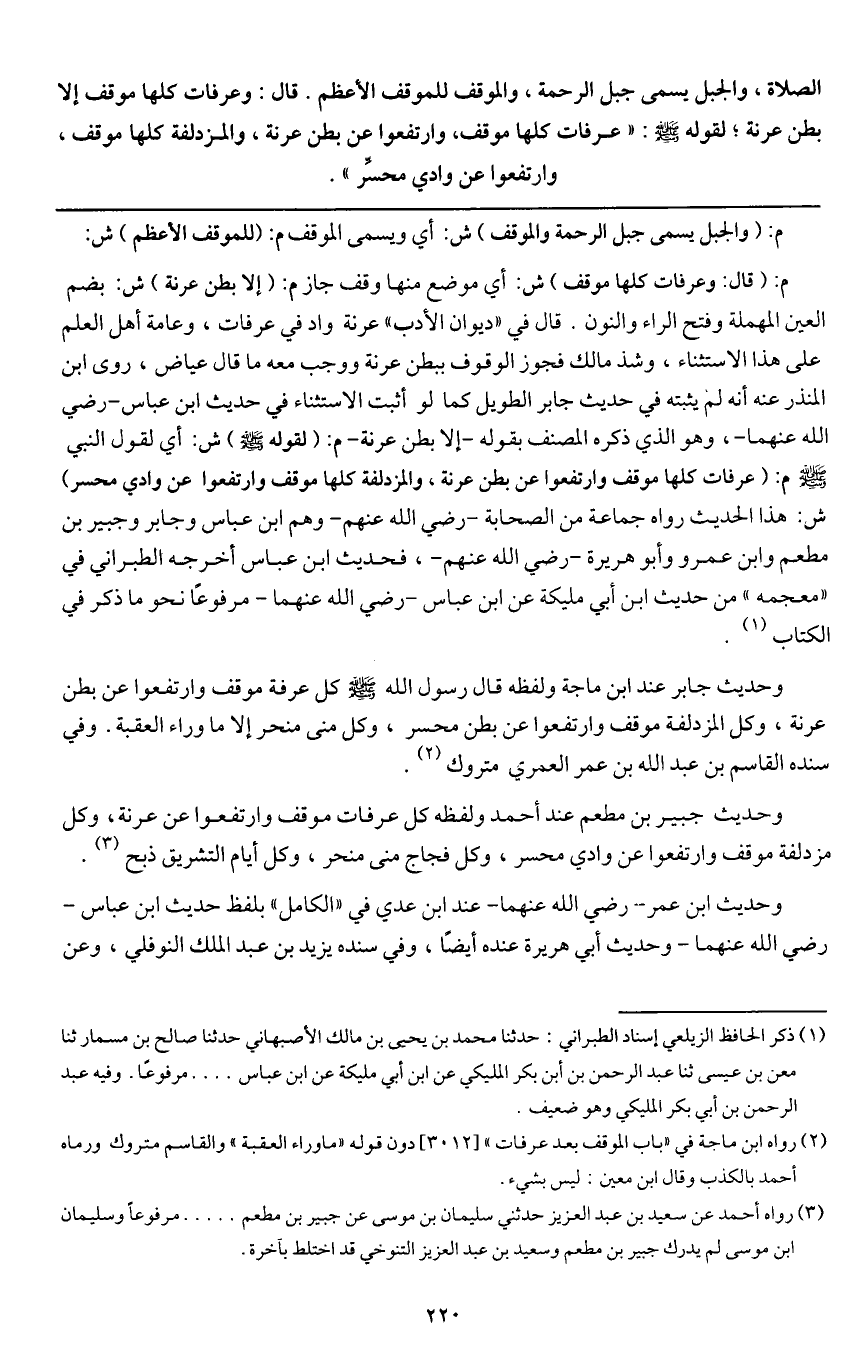 قال: وعرفات كلها موقف إلا بطن عرنة لقوله - صَلَّى اللَّهُ عَلَيْهِ وَسَلَّمَ -: «عرفات كلها موقف، وارتفعوا عن بطن عرنة والمزدلفة كلها موقف، وارتفعوا عن وادي محسر» .