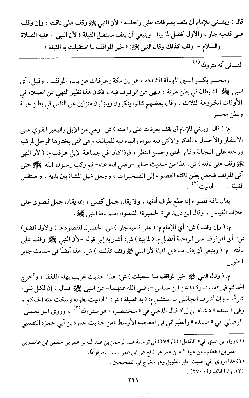قال: وينبغي للإمام أن يقف بعرفات على راحلته؛ لأن النبي - صَلَّى اللَّهُ عَلَيْهِ وَسَلَّمَ - وقف على ناقته، وإن وقف على قدميه جاز، والأول أفضل لما بينا. وينبغي أن يقف مستقبل القبلة) لأن النبي - عَلَيْهِ الصَّلَاةُ وَالسَّلَامُ - وقف كذلك، وقال النبي - صَلَّى اللَّهُ عَلَيْهِ وَسَلَّمَ -: «خير المواقف ما استقبلت به القبلة»