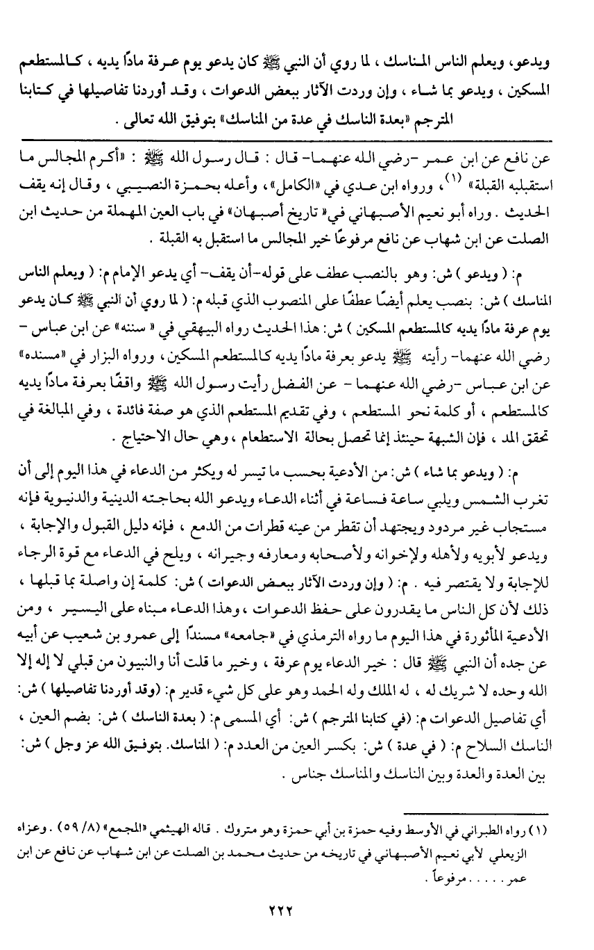 ويدعو، ويعلم الناس المناسك، لما روي «أن النبي - صَلَّى اللَّهُ عَلَيْهِ وَسَلَّمَ - كان يدعو يوم عرفة مادا يديه، كالمستطعم المسكين» ويدعو بما شاء، وإن وردت الآثار ببعض الدعوات، وقد أوردنا تفاصيلها في كتابنا المترجم " بعدة الناسك في عدة من المناسك " بتوفيق الله تعالى.
