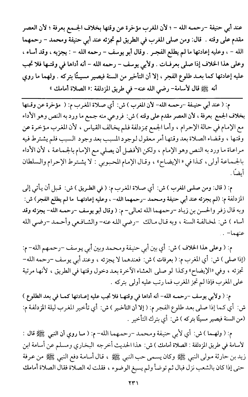 م: (قال: ومن صلى المغرب) ش: أي صلاة المغرب م: (في الطريق) ش: قبل أن يأتي إلى المزدلفة م: (لم يجزئه عند أبي حنيفة ومحمد - رحمهما الله -، وعليه إعادتها ما لم يطلع الفجر) ش: وبه قال زفر والحسن بن زياد - رحمهما الله تعالى - م: (وقال أبو يوسف - رَحِمَهُ اللَّهُ -: يجزئه، وقد أساء) ش: لمخالفة السنة، وبه قال مالك - رَضِيَ اللَّهُ عَنْهُ - والشافعي وأحمد - رَضِيَ اللَّهُ عَنْهُمَا -.
