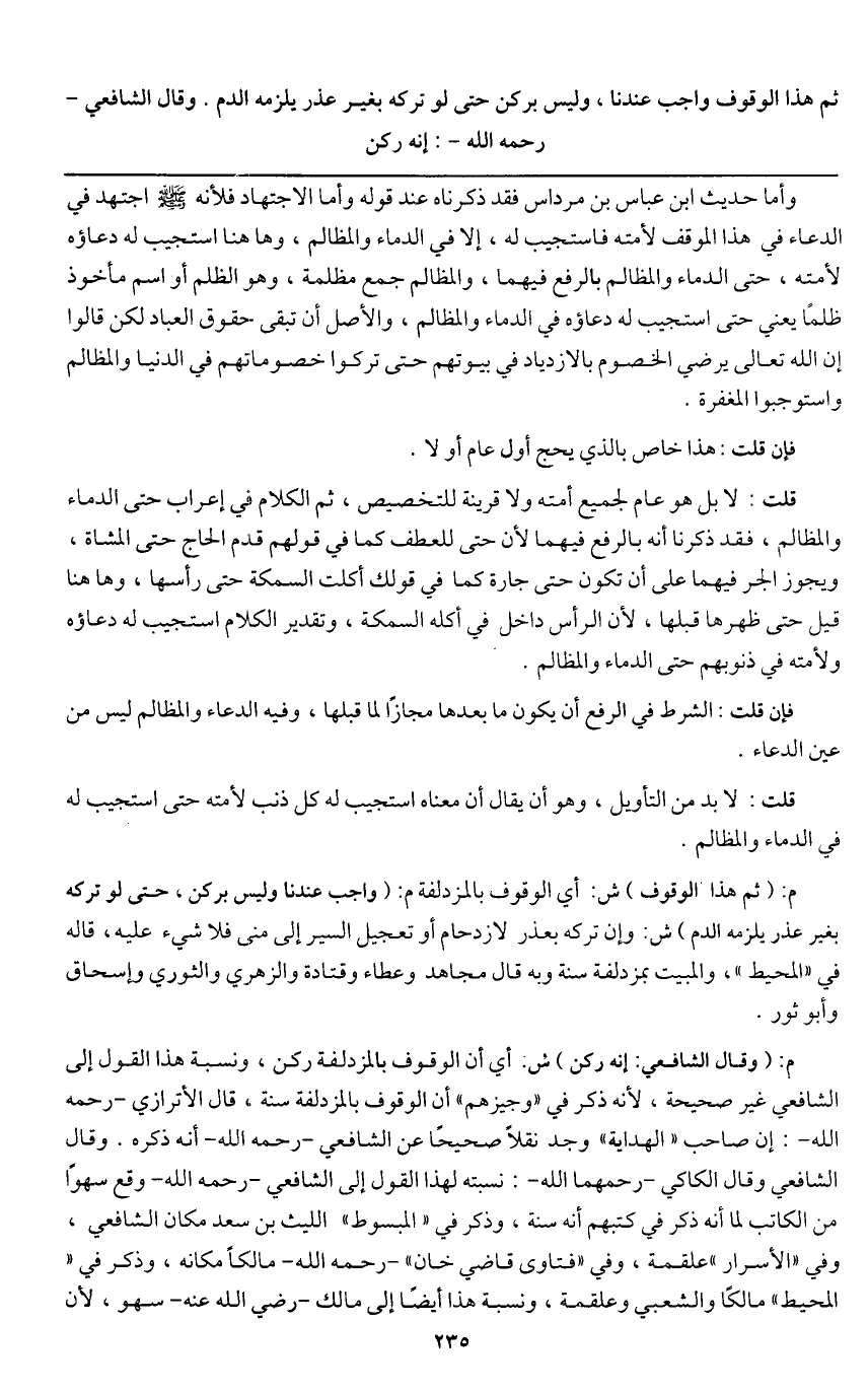 ثم هذا الوقوف واجب عندنا، وليس بركن حتى لو تركه بغير عذر يلزمه الدم. وقال الشافعي - رَحِمَهُ اللَّهُ -: إنه ركن