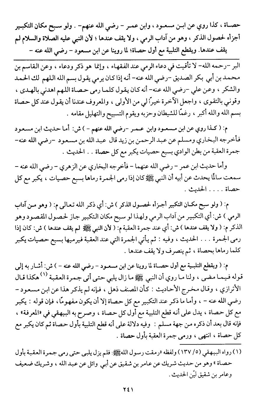 حصاة، كذا روي ابن مسعود، وابن عمر - رَضِيَ اللَّهُ عَنْهُمْ -. ولو سبح مكان التكبير أجزأه) لحصول الذكر، وهو من آداب الرمي، ولا يقف عندها؛ لأن النبي - عَلَيْهِ الصَّلَاةُ وَالسَّلَامُ - لم يقف عندها. ويقطع التلبية مع أول حصاة؛ لما روينا عن ابن مسعود - رَضِيَ اللَّهُ عَنْهُ -