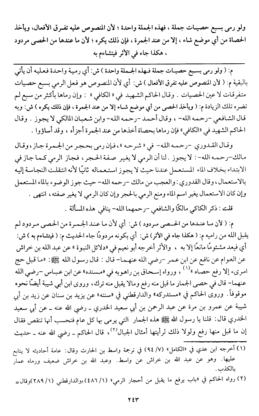 ولو رمى بسبع حصيات جملة، فهذه الجملة واحدة؛ لأن المنصوص عليه تفرق الأفعال، ويأخذ الحصاة من أي موضع شاء، إلا من عند الجمرة فإن ذلك يكره؛ لأن ما عندها من الحصى مردود، هكذا جاء في الأثر فيتشاءم به