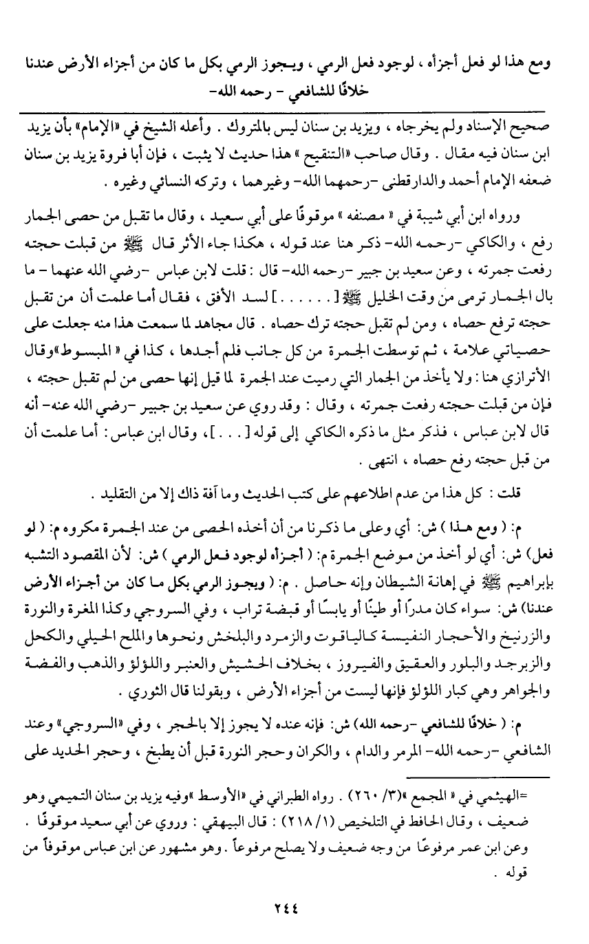 ورواه ابن أبي شيبة في " منصفه " موقوفاً على أبي سعيد، وقال ما تقبل من حصى الجمار رفع، والكاكي - رَحِمَهُ اللَّهُ - ذكر هنا عند قوله، هكذا جاء الأثر قال - صَلَّى اللَّهُ عَلَيْهِ وَسَلَّمَ - «من قبلت حجته رفعت جمرته» وعن سعيد بن جبير - رَحِمَهُ اللَّهُ - قال: قلت لابن عباس - رَضِيَ اللَّهُ عَنْهُمَا - ما بال الجمار ترمى من وقت الخليل - صَلَّى اللَّهُ عَلَيْهِ وَسَلَّمَ -[.....] لسد الأفق، فقال أما علمت أن من تقبل حجته ترفع حصاه، ومن لم تقبل حجته ترك حصاه. قال مجاهد لما سمعت هذا منه جعلت على حصياتي علامة، ثم توسطت الجمرة من كل جانب فلم أجدها، كذا في " المبسوط " وقال الأترازي هنا: ولا يأخذ من الجمار التي رميت عند الجمرة لما قيل إنها حصى من لم تقبل حجته، فإن من قبلت حجته رفعت جمرته، وقال: وقد روي عن سعيد بن جبير - رَضِيَ اللَّهُ عَنْهُ - أنه قال لابن عباس، فذكر مثل ما ذكره الكاكي إلى قوله [