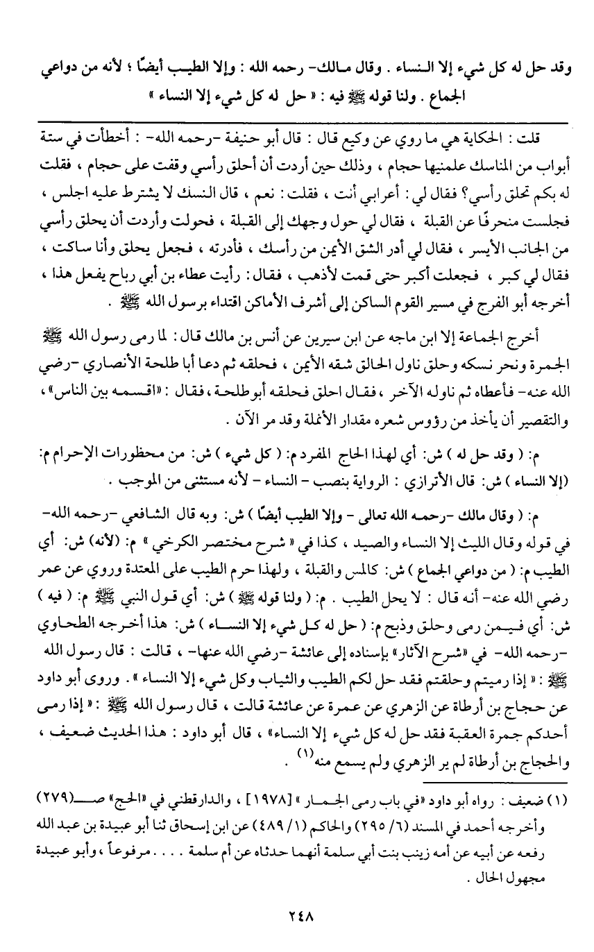 وقد حل له كل شيء إلا النساء. وقال مالك - رَحِمَهُ اللَّهُ -: وإلا الطيب أيضا؛ لأنه من دواعي الجماع. ولنا قوله - صَلَّى اللَّهُ عَلَيْهِ وَسَلَّمَ - فيه: «حل له كل شيء إلا النساء»