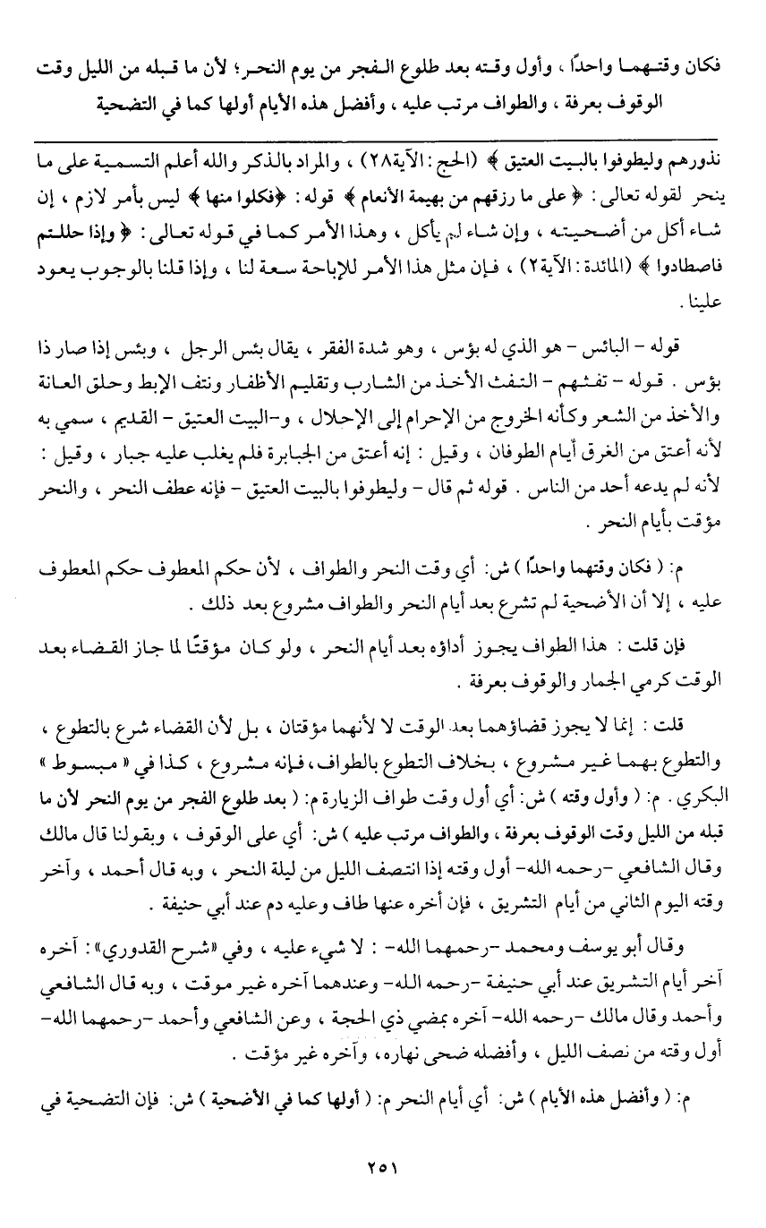 ـــــــــــــــــــــــــــــQ {ثُمَّ لْيَقْضُوا تَفَثَهُمْ وَلْيُوفُوا نُذُورَهُمْ وَلْيَطَّوَّفُوا بِالْبَيْتِ الْعَتِيقِ} [الحج: 29] (الحج: الآية 28) ، والمراد بالذكر والله أعلم التسمية على ما ينحر لِقَوْلِهِ تَعَالَى: {عَلَى مَا رَزَقَهُمْ مِنْ بَهِيمَةِ الْأَنْعَامِ} [الحج: 28] قوله: {فَكُلُوا مِنْهَا} [الحج: 28] ليس بأمر لازم، إن شاء أكل من أضحيته، وإن شاء لم يأكل، وهذا الأمر كما في قَوْله تَعَالَى: {وَإِذَا حَلَلْتُمْ فَاصْطَادُوا} [المائدة: 2] (المائدة: الآية 2) ، فإن مثل هذا الأمر للإباحة سعة لنا، وإذا قلنا بالوجوب يعود علينا.