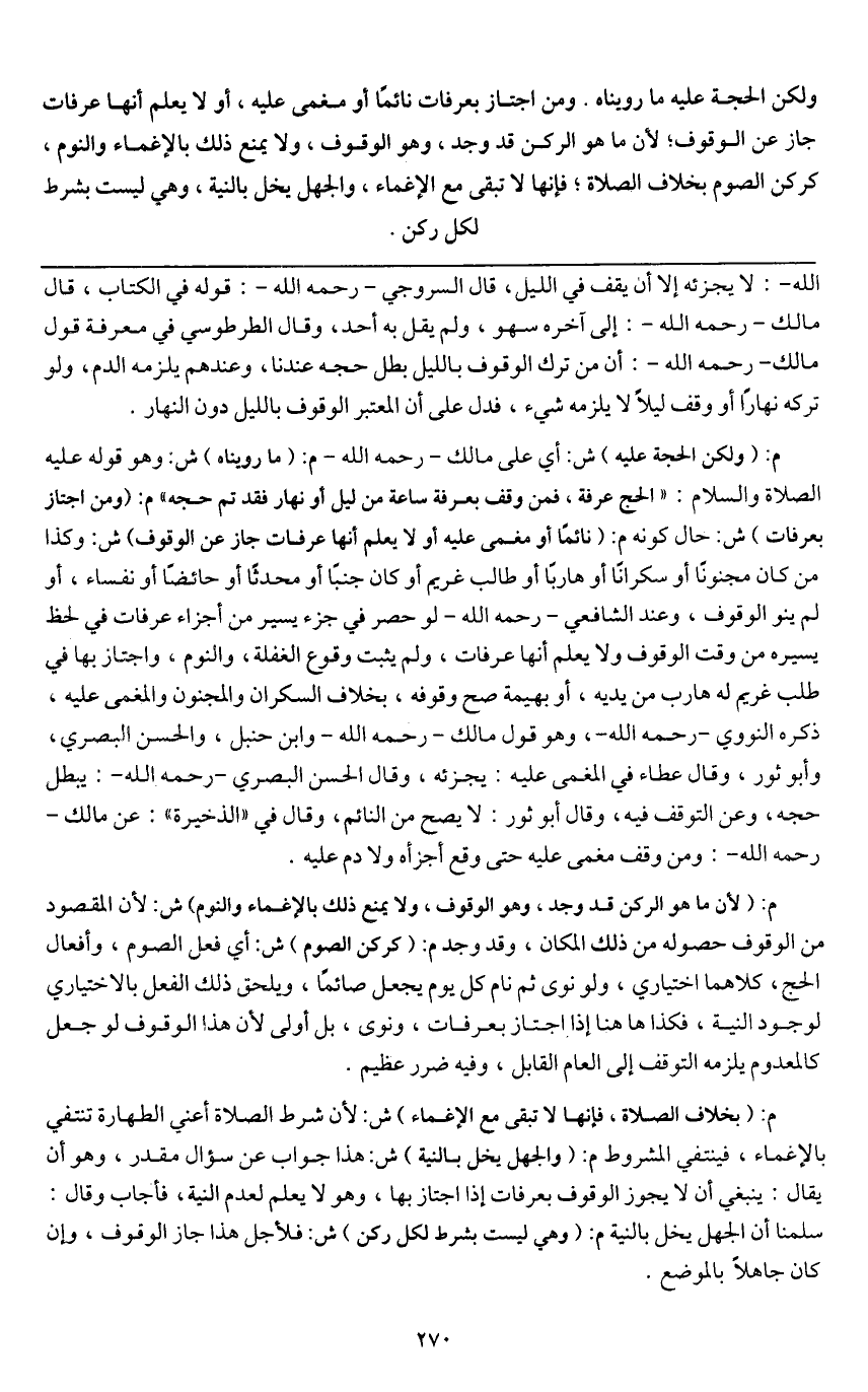 ولكن الحجة عليه ما رويناه. ومن اجتاز بعرفات نائما أو مغمى عليه، أو لا يعلم أنها عرفات جاز عن الوقوف؛ لأن ما هو الركن قد وجد، وهو الوقوف، ولا يمنع ذلك بالإغماء والنوم، كركن الصوم،