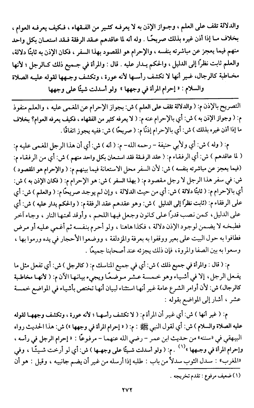 والدلالة تقف على العلم، وجواز الإذن به لا يعرفه كثير من الفقهاء، فكيف يعرفه العوام، بخلاف ما إذا أذن غيره بذلك صريحا. وله أنه لما عاقدهم عقد الرفقة فقد استعان بكل واحد منهم فيما يعجز عن مباشرته بنفسه. والإحرام هو المقصود بهذا السفر، فكان الإذن به ثابتا دلالة، والعلم ثابت نظرا إلى الدليل، والحكم يدار عليه.