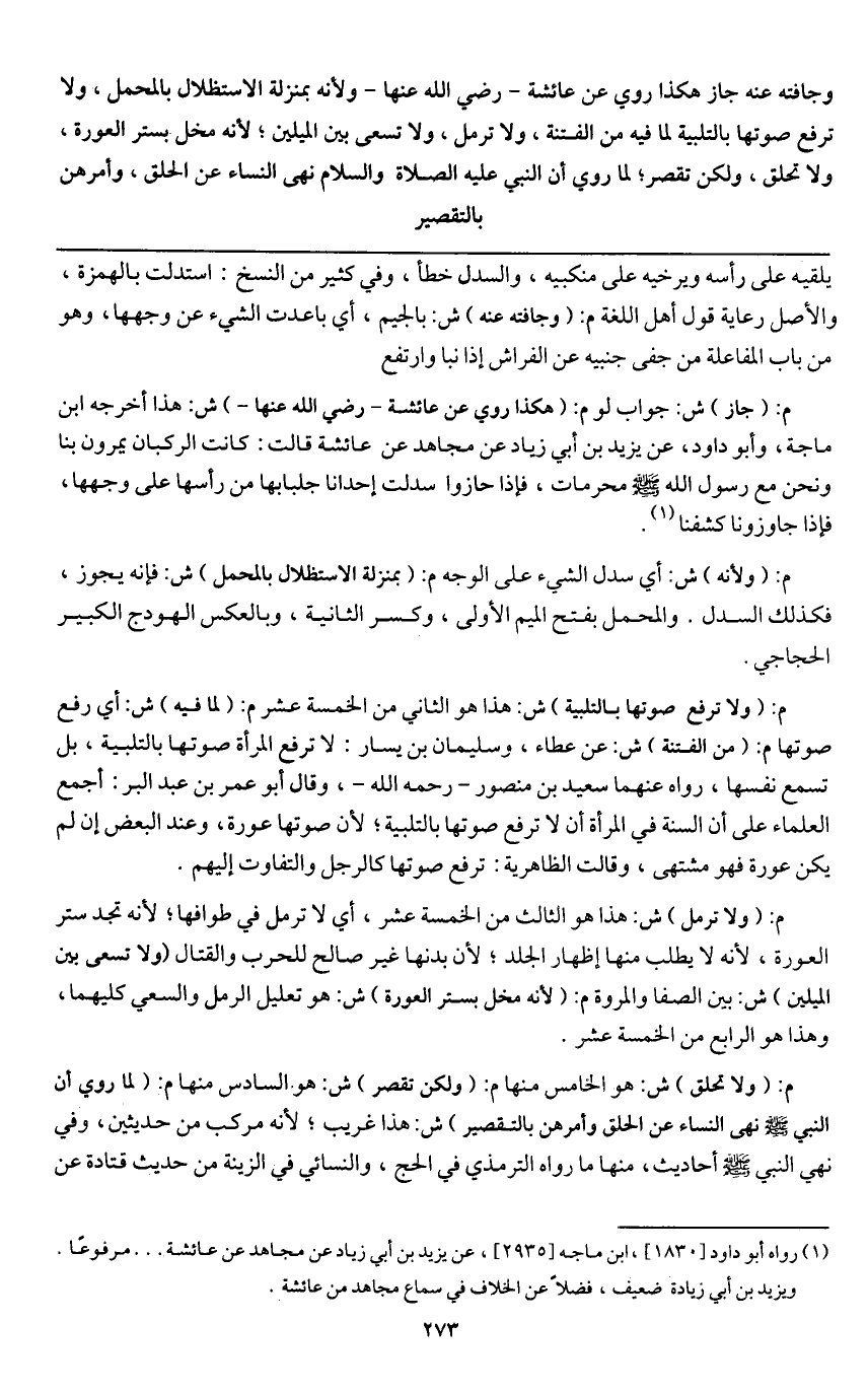 ولا ترفع صوتها بالتلبية لما فيه من الفتنة، ولا ترمل، ولا تسعى بين الميلين؛ لأنه مخل بستر العورة، ولا تحلق، ولكن تقصر؛ لما روي «أن النبي - عَلَيْهِ الصَّلَاةُ وَالسَّلَامُ - نهى النساء عن الحلق، وأمرهن بالتقصير»
