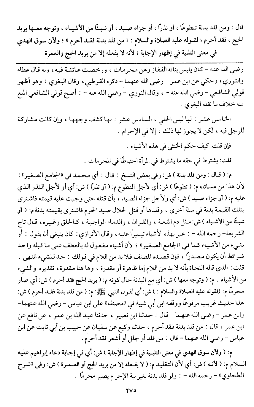 م: (قال: ومن قلد بدنة) ش: وفي بعض النسخ: قال: أي محمد في " الجامع الصغير ": لأن هذا من مسائله م: (تطوعا) ش: أي لأجل التطوع م: (أو نذرا) ش: أي أو لأجل النذر الذي عليه م: (أو جزاء صيد) ش: أي ولأجل جزاء الصيد، بأن قتله حتى وجبت عليه قيمته فاشترى بتلك القيمة بدنة في سنة أخرى، وقلدها أو قتل الحلال صيد الحرم فاشترى بقيمته بدنة م: (أو شيئا من الأشياء) ش: مثل دم المتعة، والقران، والدماء الواجبة، كالحلق وغيره، قال تاج الشريعة - رَحِمَهُ اللَّهُ -: عبر بهذه الأشياء تيسيراً عليه، وقال الأترازي: كان ينبغي أن يقول: أو بشيء من الأشياء كما في " الجامع الصغير "؛ لأن أشياء مفعول له بالعطف على ما قبله وأحد شرائطه أن يكون مصدراً، فإن قصده المصنف فلا بد من اللام في قولك: حد للشيء انتهى. قلت: الذي قاله النحاة بأنه لا بد من اللام إما ظاهرة أو مقدرة، وهاهنا مقدرة، تقديره والشيء من الأشياء. م: (وتوجه معها) ش: أي مع البدنة حال كونه م: (يريد الحج فقد أحرم) ش: أي صار محرماً م: (لقوله - عَلَيْهِ الصَّلَاةُ وَالسَّلَامُ -) ش: أي لقول النبي - صَلَّى اللَّهُ عَلَيْهِ وَسَلَّمَ - م: «من قلد بدنة فقد أحرم» ش: هذا حديث غريب مرفوعاً ووقفه ابن أبي شيبة في " مصنفه " على ابن عباس - رَضِيَ اللَّهُ عَنْهُمَا - وابن عمر - رَضِيَ اللَّهُ عَنْهُمَا - قال: حدثنا ابن نصير، حدثنا عبد الله بن عمر، عن نافع عن ابن عمر، قال: «من قلد بدنة فقد أحرم» حدثنا وكيع عن سفيان عن حبيب بن أبي ثابت عن ابن عباس - رَضِيَ اللَّهُ عَنْهُمَا - قال: «من قلد أو جلل أو أشعر فقد أحرم» .
