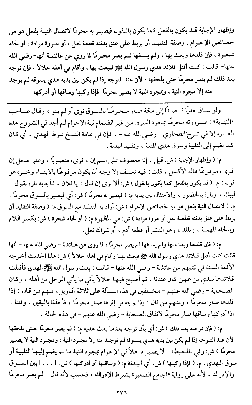 ـــــــــــــــــــــــــــــQولو ساق هدياً قاصداً إلى مكة صار محرماً بالسوق نوى أو لم ينو، وقال صاحب " النهاية ": صيرورته محرماً بمجرد السوق من غير انضمام نية الإحرام لم أجد في الشروح هذه العبارة إلا في شرح الطحاوي - رَضِيَ اللَّهُ عَنْهُ -، فإن في عامة النسخ شرط الهدي، أي كان كما يضم إلى التلبية وسوق هدي المتعة، وتقليد البدنة.