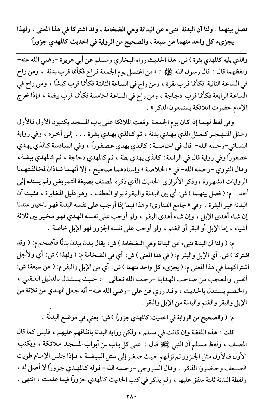 ـــــــــــــــــــــــــــــQوالذي يليه كالمهدي بقرة» ش: هذا الحديث رواه البخاري ومسلم عن أبي هريرة - رَضِيَ اللَّهُ عَنْهُ - ولفظهما قال: قال رسول الله - صَلَّى اللَّهُ عَلَيْهِ وَسَلَّمَ -: «من اغتسل يوم الجمعة فراح فكأنما قرب بدنة، ومن راح في الساعة الثانية فكأنما قرب بقرة، ومن راح في الساعة الثالثة فكأنما قرب كبشاً، ومن راح في الساعة الرابعة فكأنما قرب دجاجة، ومن راح في الساعة الخامسة فكأنما قرب بيضة، فإذا خرج الإمام حضرت الملائكة يستمعون الذكر» .