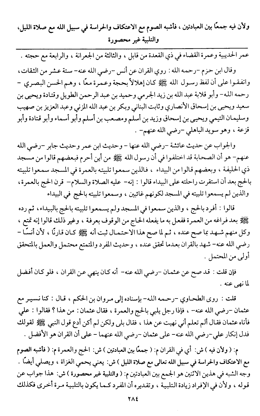 قلت: «روى الطحاوي - رَحِمَهُ اللَّهُ - بإسناده إلى مروان بن الحكم، قال: كنا نسير مع عثمان - رَضِيَ اللَّهُ عَنْهُ -، فإذا رجل يلبي بالحج والعمرة، فقال عثمان: من هذا؟ فقالوا: علي فأتاه عثمان فقال ألم تعلم أني نهيت عن هذا، فقال بلى ولكن لم أكن أدع قول النبي - صَلَّى اللَّهُ عَلَيْهِ وَسَلَّمَ - لقولك» فدل إنكار علي - رَضِيَ اللَّهُ عَنْهُ - على عثمان - رَضِيَ اللَّهُ عَنْهُمَا - على أن القران هو الأفضل.