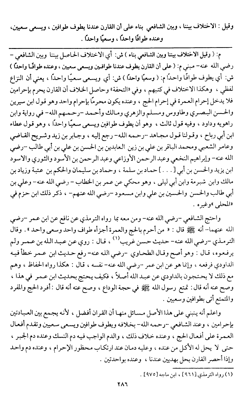 واحتج الشافعي - رَضِيَ اللَّهُ عَنْهُ - ومن معه بما رواه الترمذي عن نافع عن ابن عمر - رَضِيَ اللَّهُ عَنْهُمَا - أنه - صَلَّى اللَّهُ عَلَيْهِ وَسَلَّمَ - قال: «من أحرم بالحج والعمرة أجزأه طواف واحد وسعي واحد» . وقال الترمذي - رَضِيَ اللَّهُ عَنْهُ - حديث حسن غريب، قال: روي عن عبد الله بن عمر ولم يرفعوه، قال: وهو أصح وقال الطحاوي - رَضِيَ اللَّهُ عَنْهُ - رفع حديث ابن عمر خطأ فيه الداودي فرفعه، وإنما هو عن ابن عمر - رَضِيَ اللَّهُ عَنْهُ - نفسه، قال: هكذا رواه الحفاظ، وهم مع ذلك لا يحتجون بالداودي عن عبد الله أصلاً، فكيف يحتج بحديث ابن عمر في هذا، وصح عنه أنه قال: «تمتع رسول الله - صَلَّى اللَّهُ عَلَيْهِ وَسَلَّمَ - في حجة الوداع» وصح عنه أنه قال: «أفرد الحج والمفرد والمتمتع أتى بطوافين وسعيين» .