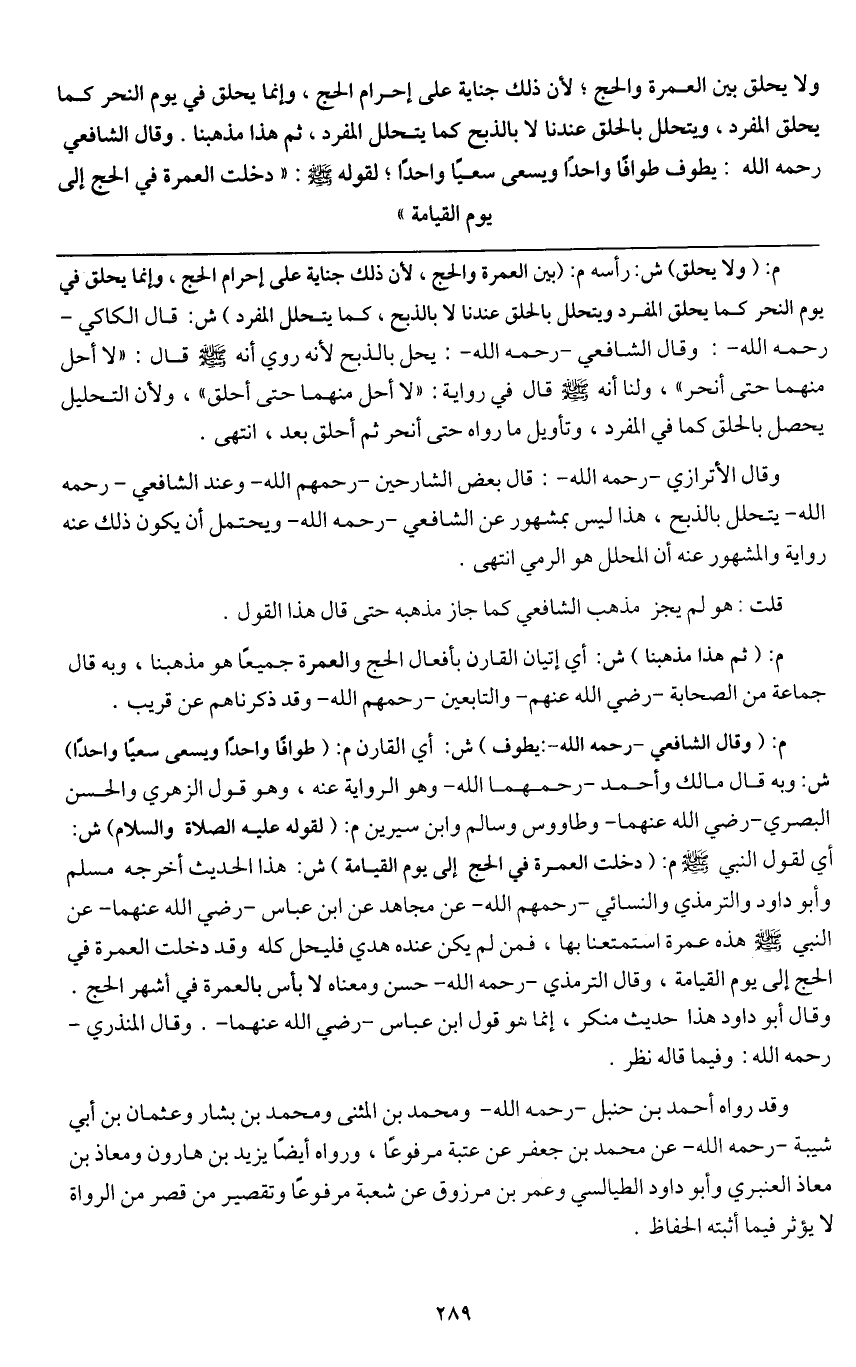 ولا يحلق بين العمرة والحج؛ لأن ذلك جناية على إحرام الحج، وإنما يحلق في يوم النحر كما يحلق المفرد، ويتحلل بالحلق عندنا لا بالذبح كما يتحلل المفرد، ثم هذا مذهبنا. وقال الشافعي - رَحِمَهُ اللَّهُ -: يطوف طوافا واحدا ويسعى سعيا واحدا؛ لقوله - صَلَّى اللَّهُ عَلَيْهِ وَسَلَّمَ -: «دخلت العمرة في الحج إلى يوم القيامة»