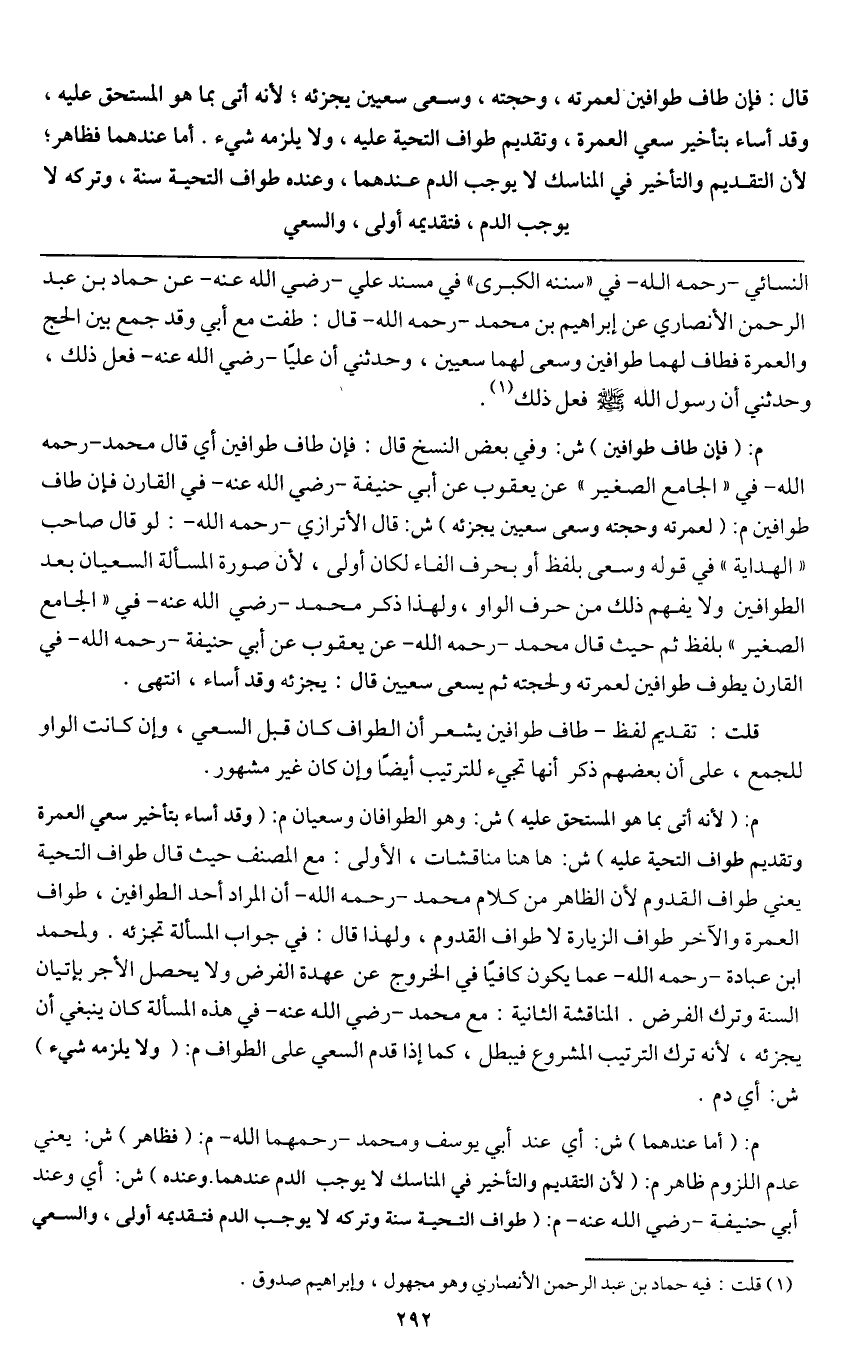 ـــــــــــــــــــــــــــــQالنسائي - رَحِمَهُ اللَّهُ - في " سننه الكبرى " في مسند علي - رَضِيَ اللَّهُ عَنْهُ - عن حماد بن عبد الرحمن الأنصاري «عن إبراهيم بن محمد - رَحِمَهُ اللَّهُ - قال: طفت مع أبي وقد جمع بين الحج والعمرة فطاف لهما طوافين وسعى لهما سعيين وحدثني أن عليا - رَضِيَ اللَّهُ عَنْهُ - فعل ذلك، وحدثني أن رسول الله فعل ذلك» .