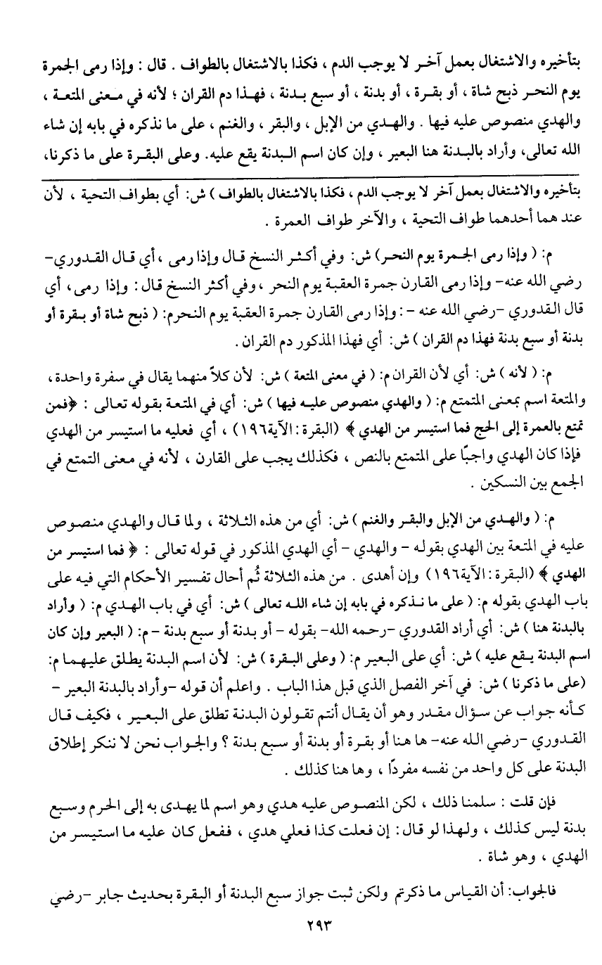 قال: وإذا رمى الجمرة يوم النحر ذبح شاة، أو بقرة، أو بدنة، أو سبع بدنة، فهذا دم القران؛ لأنه في معنى المتعة، والهدي منصوص عليه فيها، والهدي من الإبل، والبقر، والغنم، على ما نذكره في بابه إن شاء الله تعالى، وأراد بالبدنة هنا البعير، وإن كان اسم البدنة يقع عليه. وعلى البقرة على ما ذكرنا،