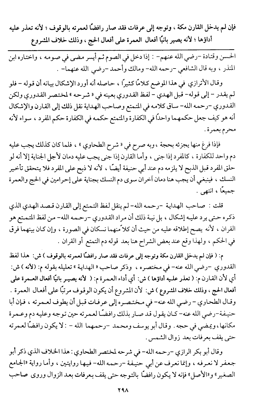 وقال أبو بكر الرازي - رَحِمَهُ اللَّهُ - في شرحه لمختصر الطحاوي: هذا الخلاف الذي ذكر أبو جعفر لا نعرفه، وإنما نعرف عن أبي حنيفة - رَحِمَهُ اللَّهُ - فيها روايتين، وأما رواية " الجامع الصغير " و " الأصل " فإنه لا يكون رافضاً بالتوجه حتى يقف بعرفات بعد الزوال وروى صاحب