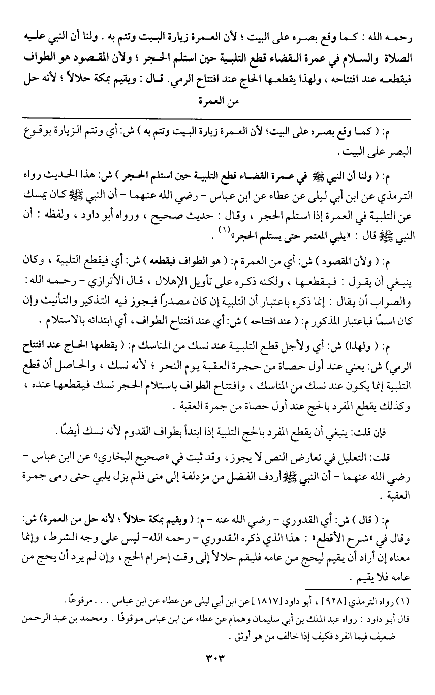 م: (ولنا «أن النبي - صَلَّى اللَّهُ عَلَيْهِ وَسَلَّمَ - في عمرة القضاء قطع التلبية حين استلم الحجر» ش: هذا الحديث رواه الترمذي عن ابن أبي ليلى عن عطاء عن ابن عباس - رَضِيَ اللَّهُ عَنْهُمَا - «أن النبي - صَلَّى اللَّهُ عَلَيْهِ وَسَلَّمَ - كان يمسك عن التلبية في العمرة إذا استلم الحجر» وقال: حديث صحيح، ورواه أبو داود، ولفظه: أن النبي - صَلَّى اللَّهُ عَلَيْهِ وَسَلَّمَ - قال: «يلبي المعتمر حتى يستلم الحجر» .