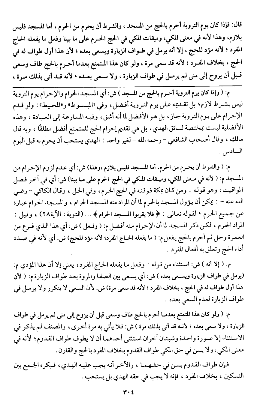 والشرط أن يحرم من الحرم أما المسجد فليس بلازم؛ وهذا لأنه في معنى المكي، وميقات المكي في الحج الحرم على ما بينا وفعل ما يفعله الحاج المفرد؛ لأنه مؤد للحج، إلا أنه يرمل في طواف الزيارة ويسعى بعده؛ لأن هذا أول طواف له في الحج، بخلاف المفرد؛ لأنه قد سعى مرة، ولو كان هذا المتمتع بعدما أحرم بالحج طاف وسعى قبل أن يروح إلى منى لم يرمل في طواف الزيارة ولا سعى بعده؛ لأنه قد أتى بذلك مرة،