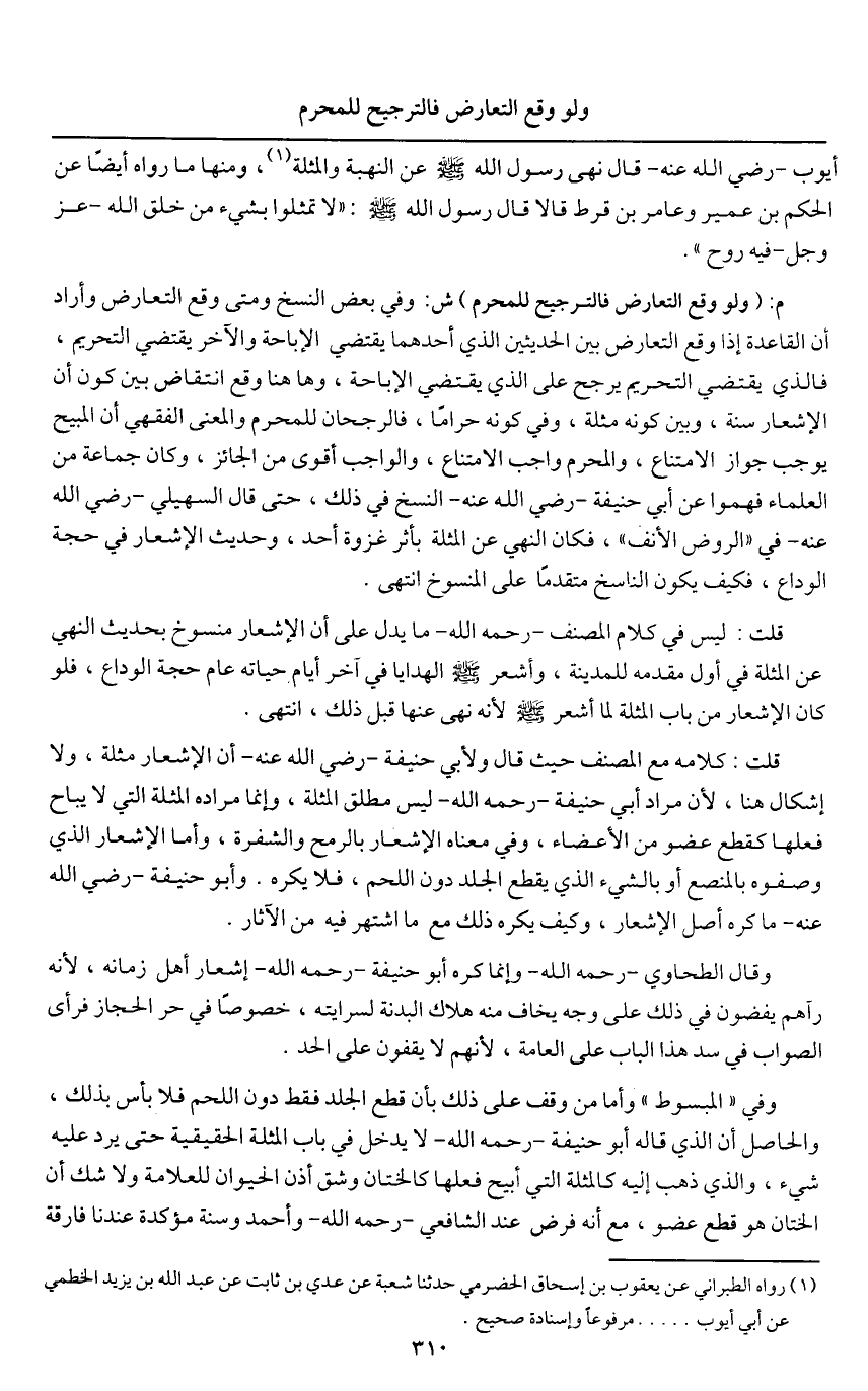 م: (ولو وقع التعارض فالترجيح للمحرم) ش: وفي بعض النسخ ومتى وقع التعارض وأراد أن القاعدة إذا وقع التعارض بين الحديثين الذي أحدهما يقتضي الإباحة والآخر يقتضي التحريم، فالذي يقتضي التحريم يرجح على الذي يقتضي الإباحة، وهاهنا وقع انتقاض بين كون أن الإشعار سنة، وبين كونه مثلة، وفي كونه حراماً، فالرجحان للمحرم والمعنى الفقهي أن المبيح يوجب جواز الامتناع، والمحرم واجب الامتناع، والواجب أقوى من الجائز، وكان جماعة من العلماء فهموا عن أبي حنيفة - رَضِيَ اللَّهُ عَنْهُ - النسخ في ذلك، حتى قال السهيلي - رَضِيَ اللَّهُ عَنْهُ - في " الروض الأنف "، فكان النهي عن المثلة بأثر غزوة أحد، وحديث الإشعار في حجة الوداع، فكيف يكون الناسخ متقدما ًعلى المنسوخ انتهى.
