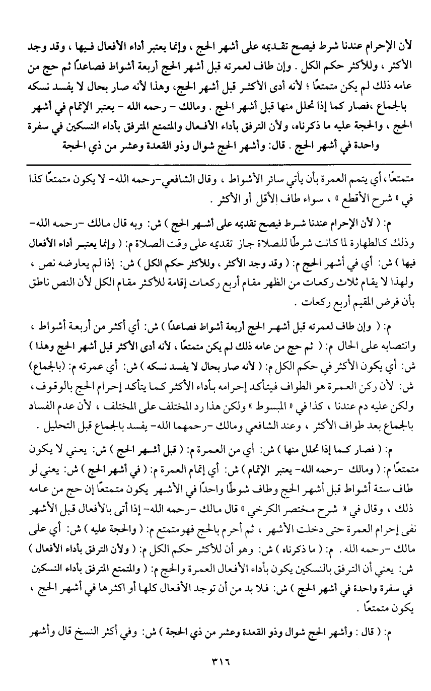 م: (فصار كما إذا تحلل منها) ش: أي من العمرة م: (قبل أشهر الحج) ش: يعني لا يكون متمتعاً م: (ومالك - رَحِمَهُ اللَّهُ - يعتبر الإتمام) ش: أي إتمام العمرة م: (في أشهر الحج) ش: يعني لو طاف ستة أشواط قبل أشهر الحج وطاف شوطاً واحداً في الأشهر يكون متمتعاً إن حج من عامه ذلك، وقال في " شرح مختصر الكرخي " قال مالك - رَحِمَهُ اللَّهُ - إذا أتى بالأفعال قبل الأشهر نفى إحرام العمرة حتى دخلت الأشهر، ثم أحرم بالحج فهو متمتع م: (والحجة عليه) ش: أي على مالك - رَحِمَهُ اللَّهُ -. م: (ما ذكرنا) ش: وهو أن للأكثر حكم الكل م: (ولأن الترفق بأداء الأفعال) ش: يعني أن الترفق بالنسكين يكون بأداء الأفعال العمرة والحج م: (والمتمتع مترفق بأداء النسكين في سفرة واحدة في أشهر الحج) ش: فلا بد من أن توجد الأفعال كلها أو أكثرها في أشهر الحج، يكون متمتعاً.