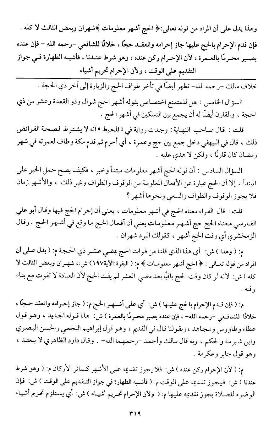 السؤال السادس: أن قوله الحج أشهر معلومات مبتدأ وخبر، فكيف يصح حمل الخبر على المبتدأ، إلا أن الحج عبارة عن الأفعال المعلومة من الوقوف والطواف وغير ذلك، والأشهر زمان فلا يجوز الوقوف والطواف والسعي ونحوها أشهر؟