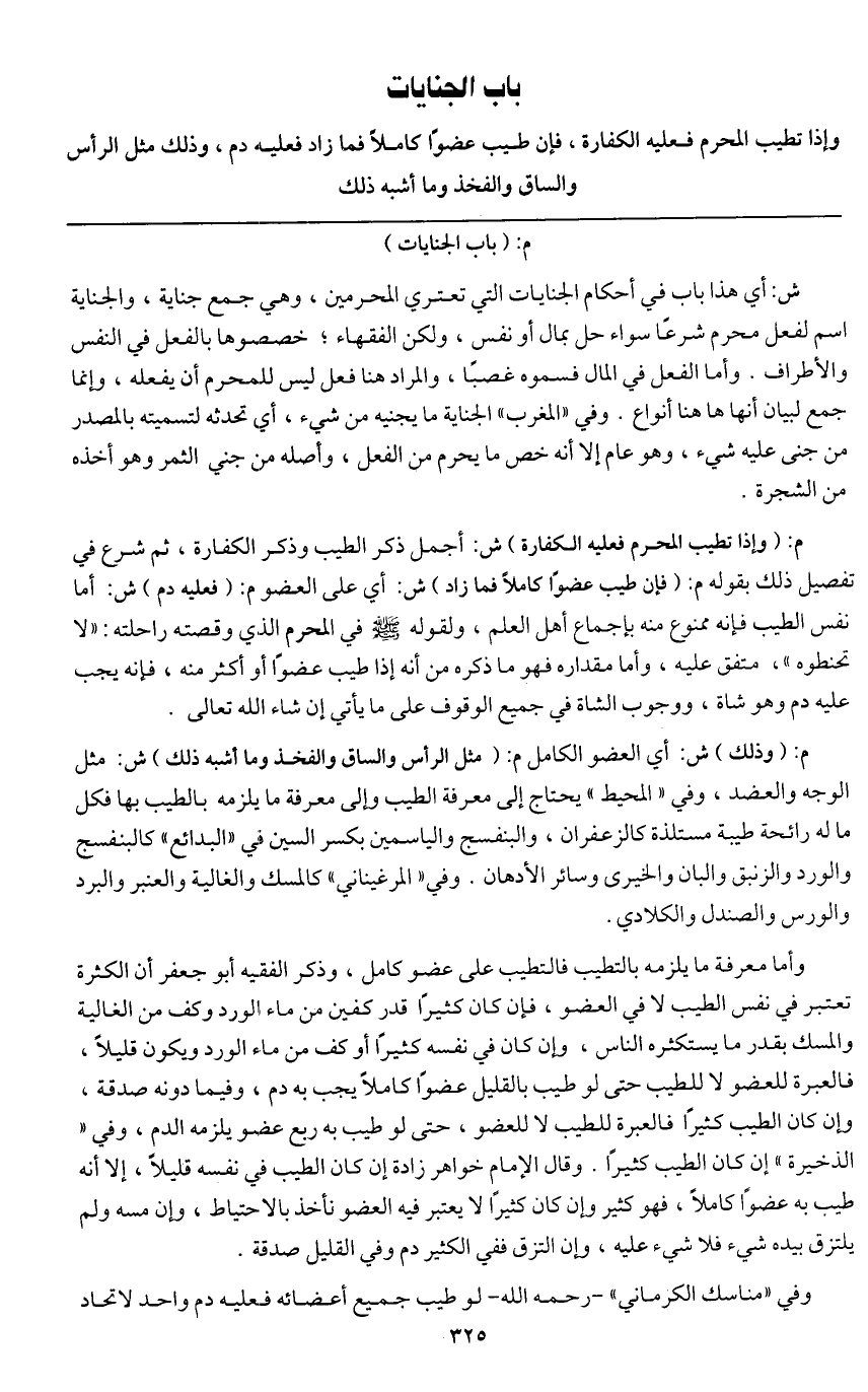 باب الجنايات وإذا تطيب المحرم فعليه الكفارة، فإن طيب عضوا كاملا فما زاد فعليه دم، وذلك مثل الرأس والساق والفخذ وما أشبه ذلك