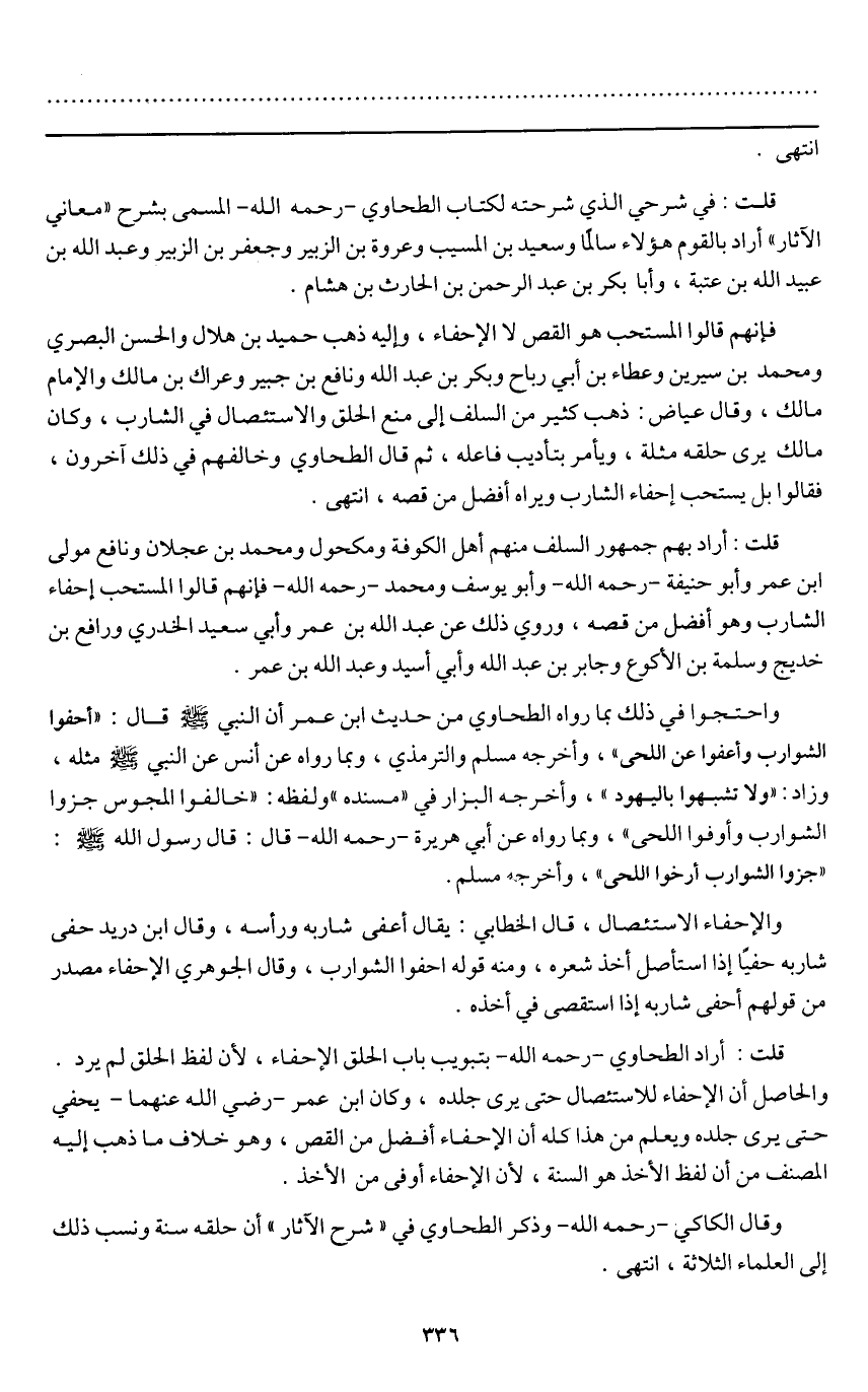 فإنهم قالوا المستحب هو القص لا الإحفاء، وإليه ذهب حميد بن هلال والحسن البصري ومحمد بن سيرين وعطاء بن أبي رباح وبكر بن عبد الله ونافع بن جبير وعراك بن مالك والإمام مالك، وقال عياض: ذهب كثير من السلف إلى منع الحلق والاستئصال في الشارب، وكان مالك يرى حلقه مثلة، ويأمر بتأديب فاعله، ثم قال الطحاوي وخالفهم في ذلك آخرون، فقالوا بل يستحب إحفاء الشارب ويراه أفضل من قصه، انتهى.