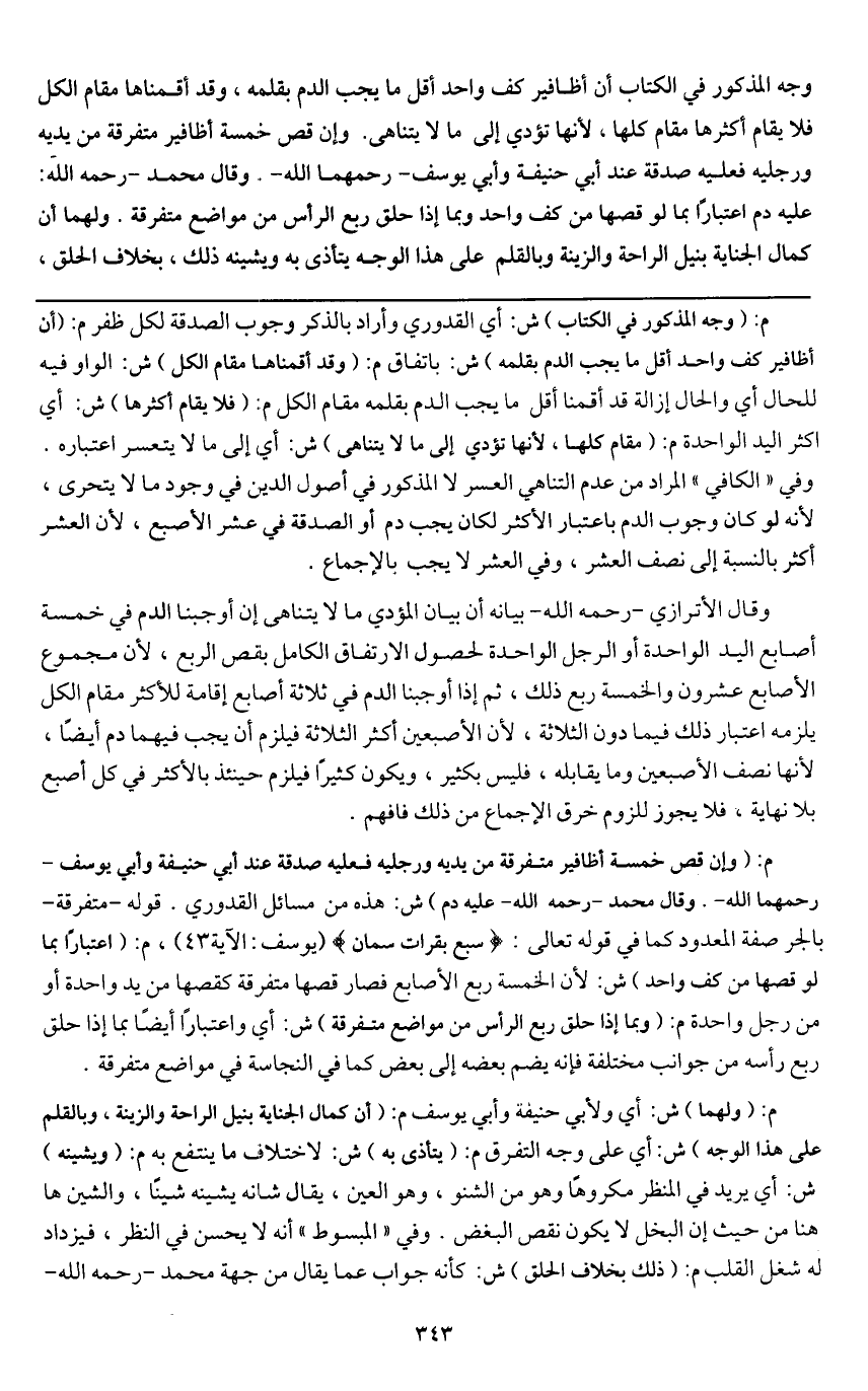 م: (ولهما) ش: أي ولأبي حنيفة وأبي يوسف م: (أن كمال الجناية بنيل الراحة والزينة وبالقلم على هذا الوجه) ش: أي على وجه التفرق م: (يتأذى به) ش: لاختلاف ما ينتفع به م: (ويشينه) ش: أي يريد في المنظر مكروهاً وهو من الشنو، وهو العين، يقال شانه يشينه شيناً، والشين هاهنا من حيث إن البخل لا يكون نقص البغض. وفي " المبسوط " أنه لا يحسن في النظر، فيزداد له شغل القلب م: (ذلك، بخلاف الحلق) ش: كأنه جواب عما يقال من جهة محمد - رَحِمَهُ اللَّهُ -