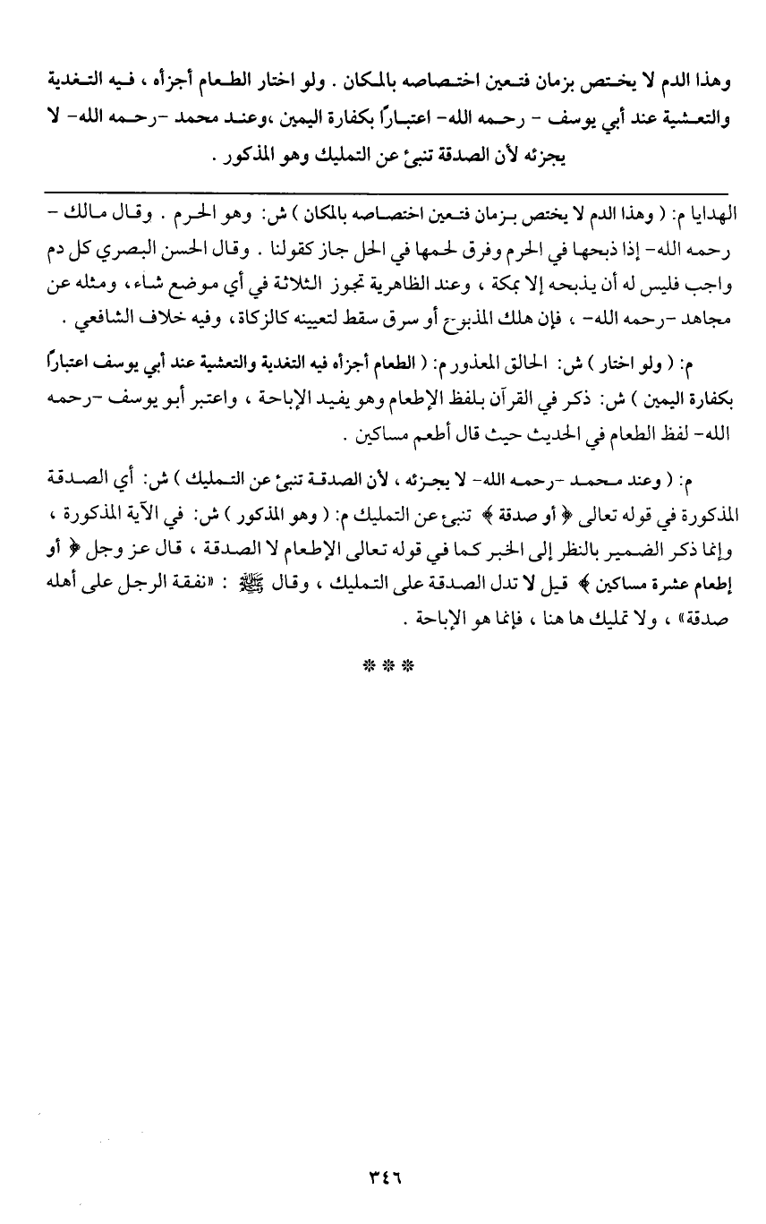 وهذا الدم لا يختص بزمان فتعين اختصاصه بالمكان. ولو اختار الطعام أجزأه، فيه التغذية والتعشية عند أبي يوسف - رَحِمَهُ اللَّهُ - اعتبارا بكفارة اليمين، وعند محمد - رَحِمَهُ اللَّهُ - لا يجزئه؛ لأن الصدقة تنبئ عن التمليك وهو المذكور.