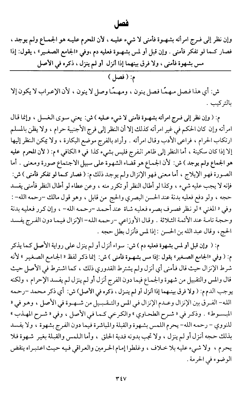 فصل وإن نظر إلى فرج امرأته بشهوة فأمنى لا شيء عليه؛ لأن المحرم هو الجماع ولم يوجد، فصار كما لو تفكر فأمنى.