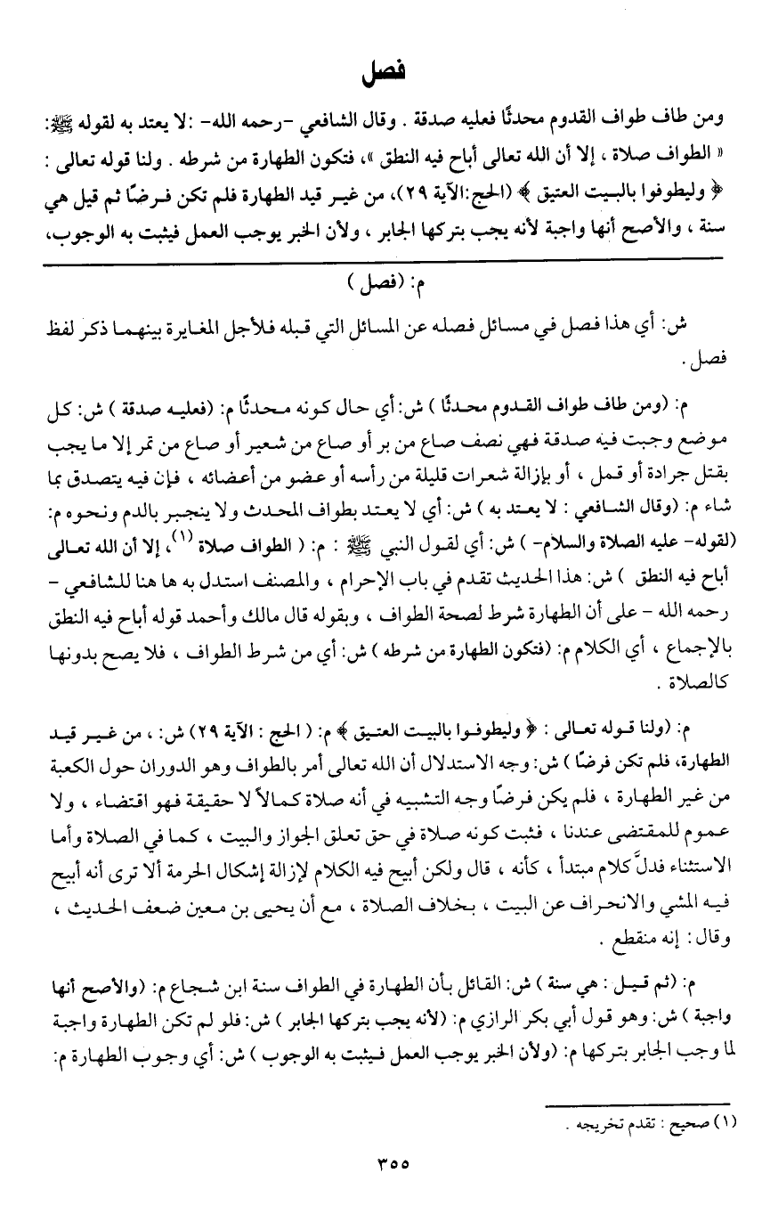 فصل ومن طاف طواف القدوم محدثا فعليه صدقة. وقال الشافعي - رَحِمَهُ اللَّهُ -: لا يعتد به لقوله - صَلَّى اللَّهُ عَلَيْهِ وَسَلَّمَ -: «الطواف صلاة، إلا أن الله تعالى أباح فيه النطق» ، فتكون الطهارة من شرطه. ولنا قَوْله تَعَالَى {وَلْيَطَّوَّفُوا بِالْبَيْتِ الْعَتِيقِ} [الحج: 29] (الحج: الآية 29) ، من غير قيد الطهارة فلم تكن فرضا ثم قيل: هي سنة، والأصح أنها واجبة لأنه يجب بتركها الجابر؛ ولأن الخبر يوجب العمل فيثبت به الوجوب،