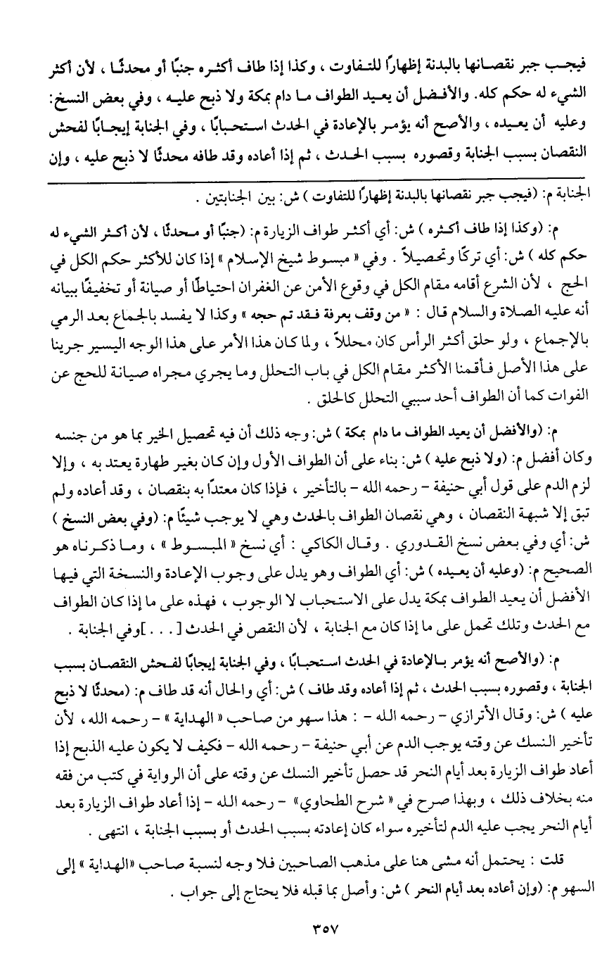 فيجب جبر نقصانها بالبدنة إظهارا للتفاوت، وكذا إذا طاف أكثره جنبا أو محدثا، لأن أكثر الشيء له حكم كله. والأفضل أن يعيد الطواف ما دام بمكة ولا ذبح عليه، وفي بعض النسخ: وعليه أن يعيده،
